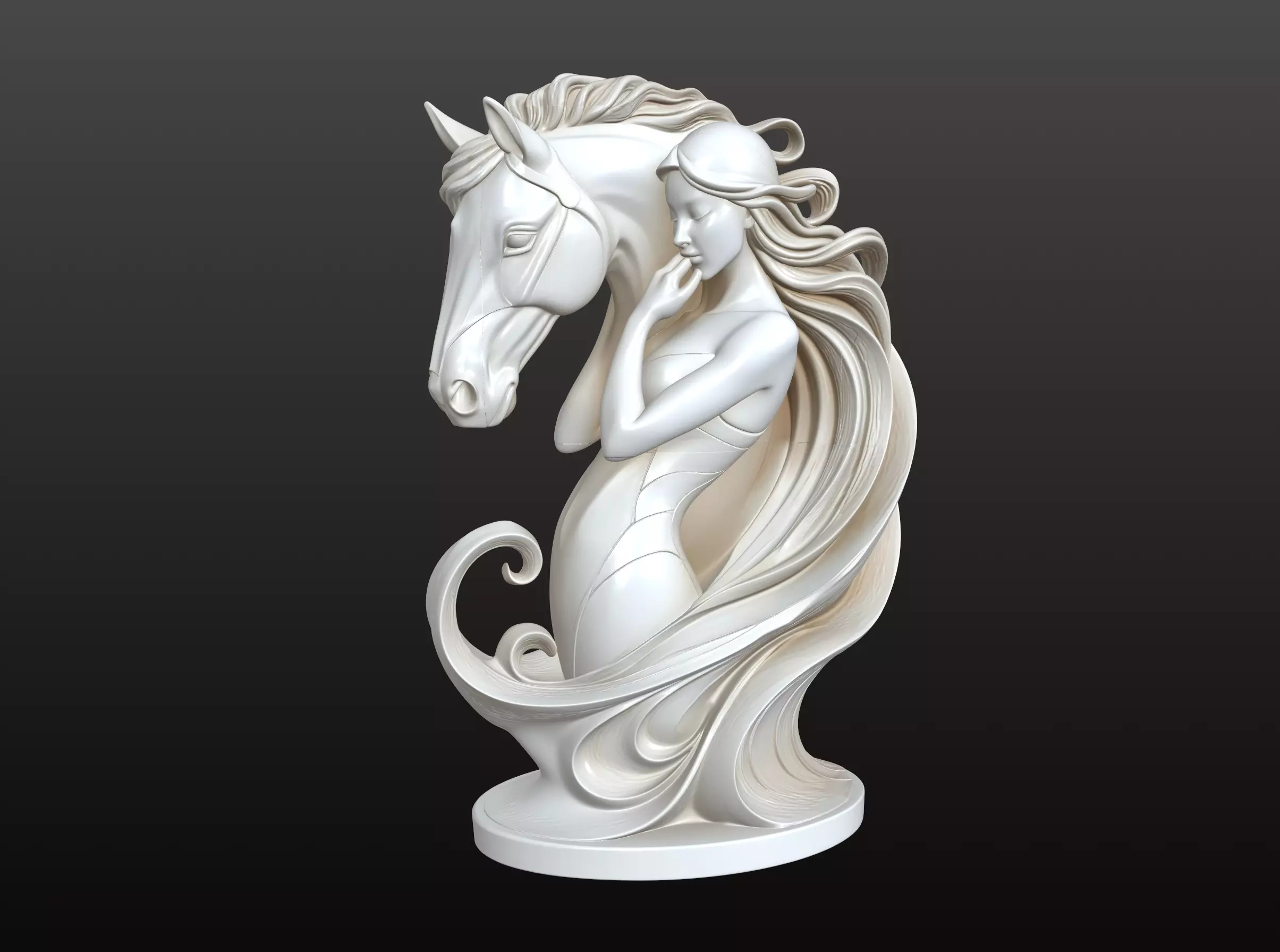 A graceful and emotionally powerful 3D sculpture depicting a beautiful woman intertwined with a majestic horse in a dance of flowing movement and sculptural harmony. The composition blends human elegance with animal strength, creating a unique artistic form where bodies and lines merge into a single, sinuous silhouette. The result is a refined and poetic sculpture that evokes balance, freedom, and deep connection with nature.