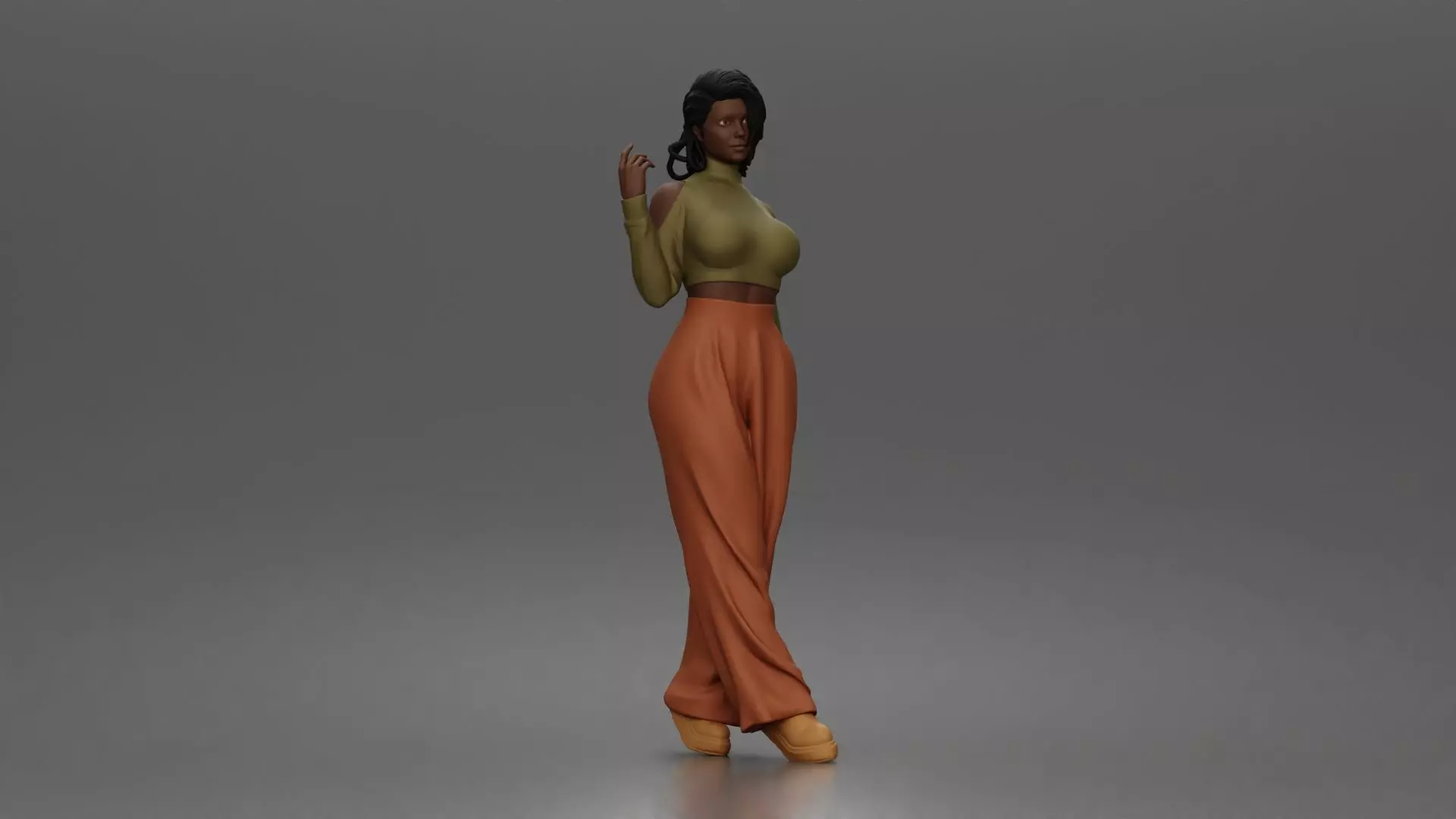 woman flaunts cold shoulder crop turtleneck wide leg trousers 3D print model