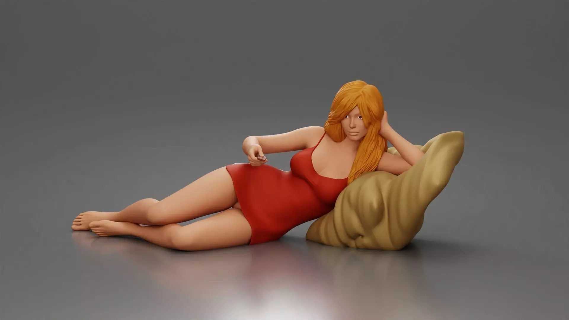 Woman lounges pillow watching holding remote wearing slip dress 3D print model