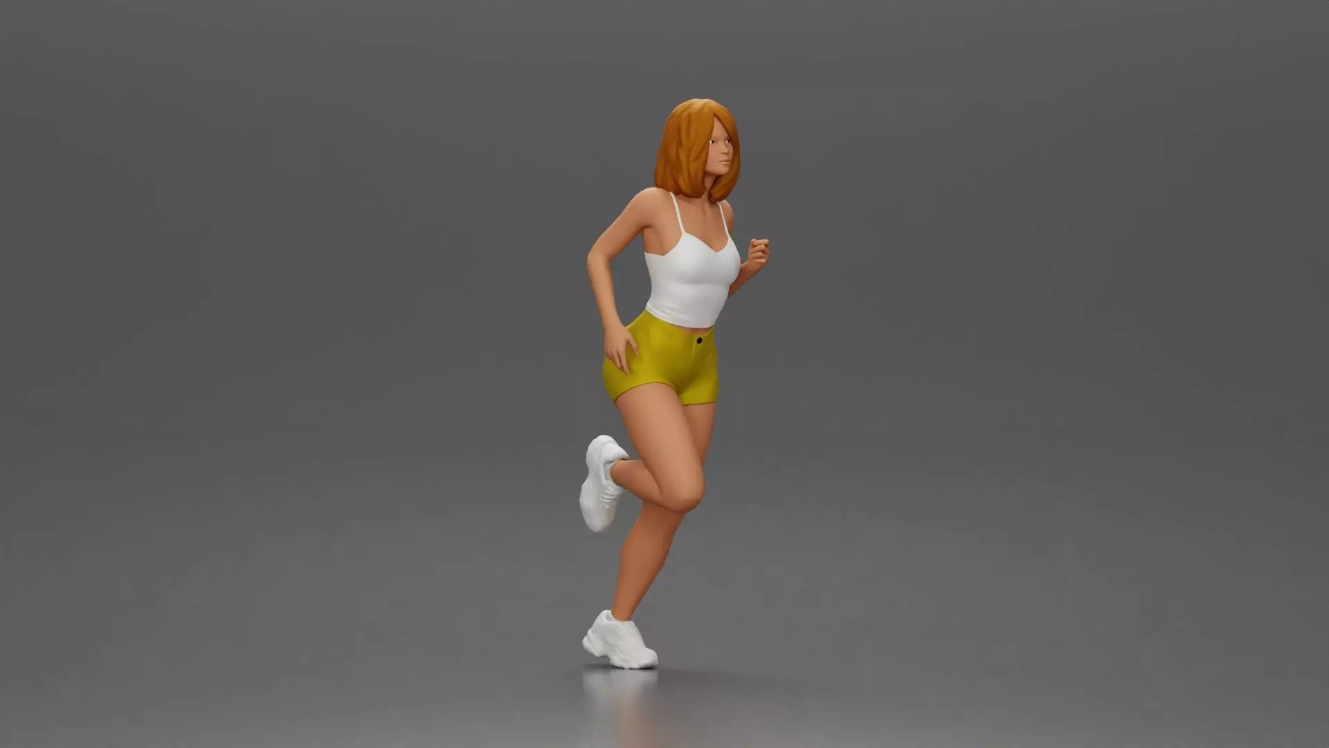 Woman with short hair wearing top and yellow shorts running 3D print model