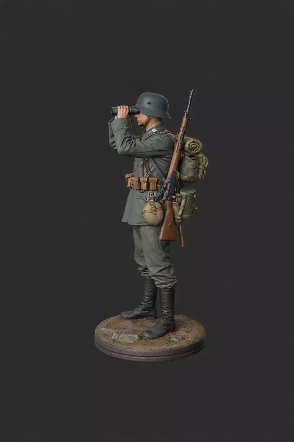 High-detail 3D printable WW1 German soldier figure in standing pose with rifle and binoculars.