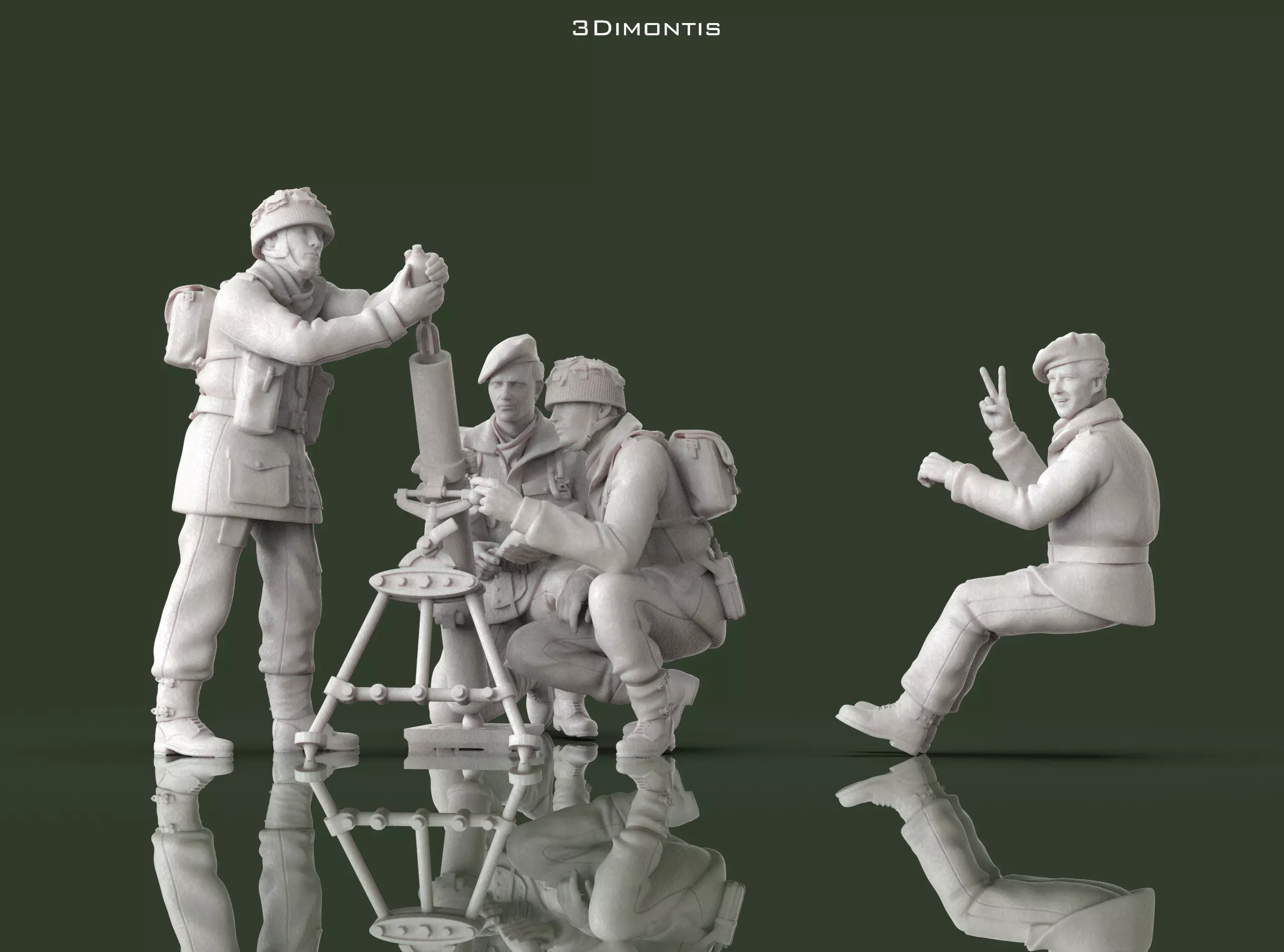 Highly detailed WW2 British Paratroopers miniature set with ML 3-inch mortar, designed for historical dioramas, military modeling, and large-scale WWII displays. The set represents a British airborne mortar crew operating the weapon along with an additional driver figure, allowing you to create realistic battlefield or support scenes.