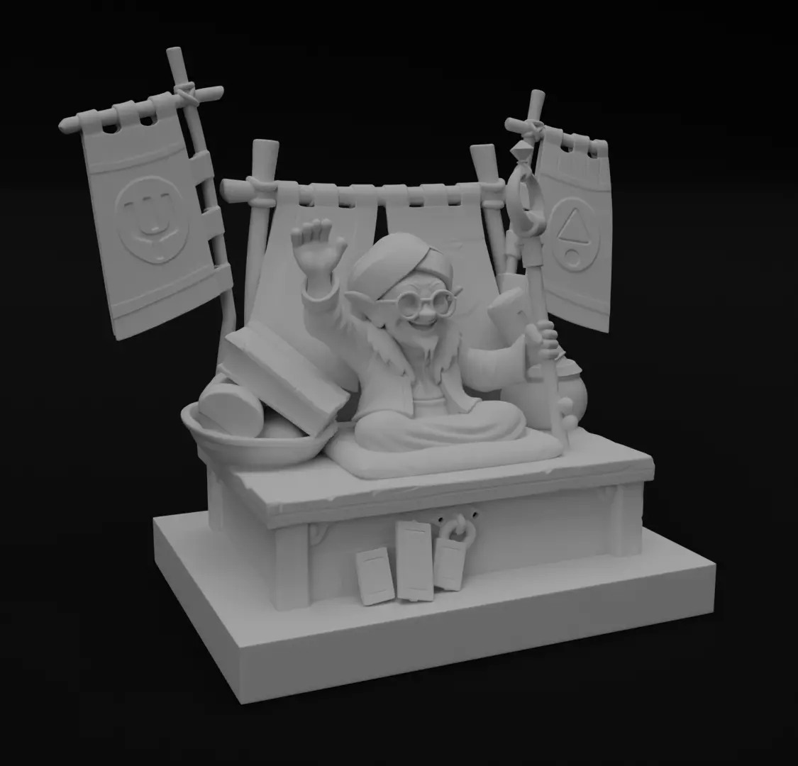 The sculpt features exceptional attention to detail, from Wycoon’s expressive face and round glasses to his traditional clothing, staff, and the richly decorated merchant stand surrounding him. Banners, props, books, and accessories add depth and storytelling to the composition, making the figure feel alive and full of character. Every element has been carefully designed to preserve the spirit of the original character while remaining optimized for high-quality 3D printing.