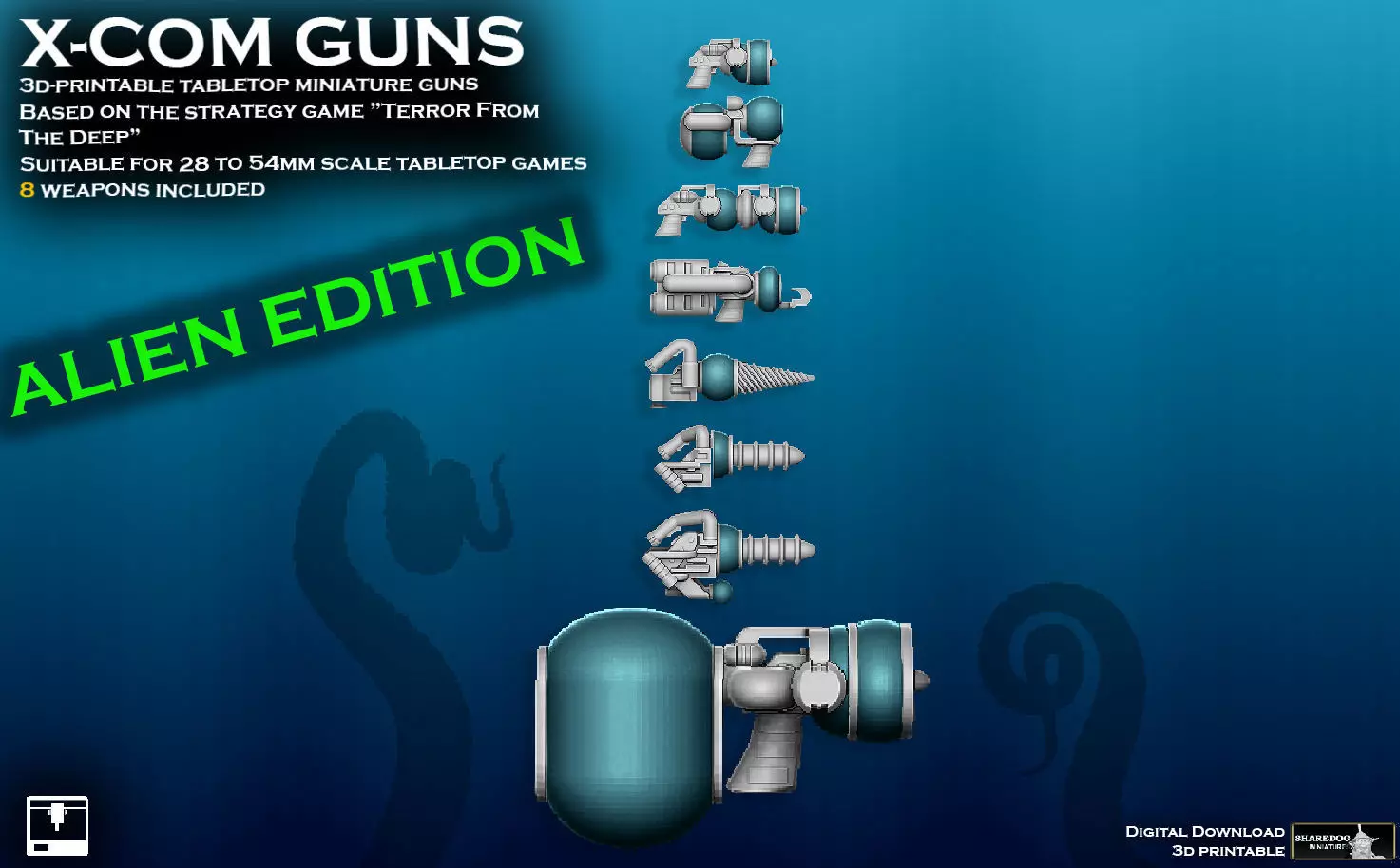 3d-printable versions of the weapons from the classic computer strategy game X-COM Terror From The Deep (1995).