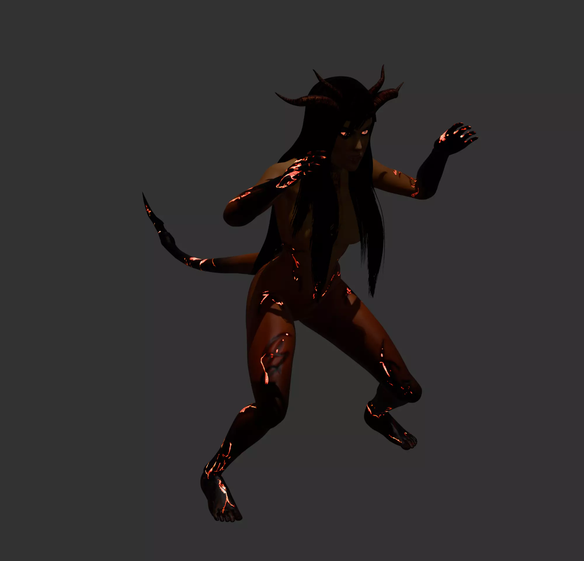 This 3D model depicts a demonic humanoid figure posed in a dynamic, forward-leaning stance that conveys motion and aggression. The character features prominent curved horns, elongated ears, and a long tail, clearly defining a supernatural or infernal origin. The surface of the body is marked with glowing, vein-like fissures that suggest internal energy or corruption coursing beneath the skin, adding visual contrast and a sense of power. Long hair frames the face and flows naturally with the pose, while the hands are raised in a claw-like gesture, reinforcing a predatory, creature-like presence. The sculpt emphasizes anatomy, expression, and surface detailing, making the model suitable for dark fantasy, horror, or game-related projects
