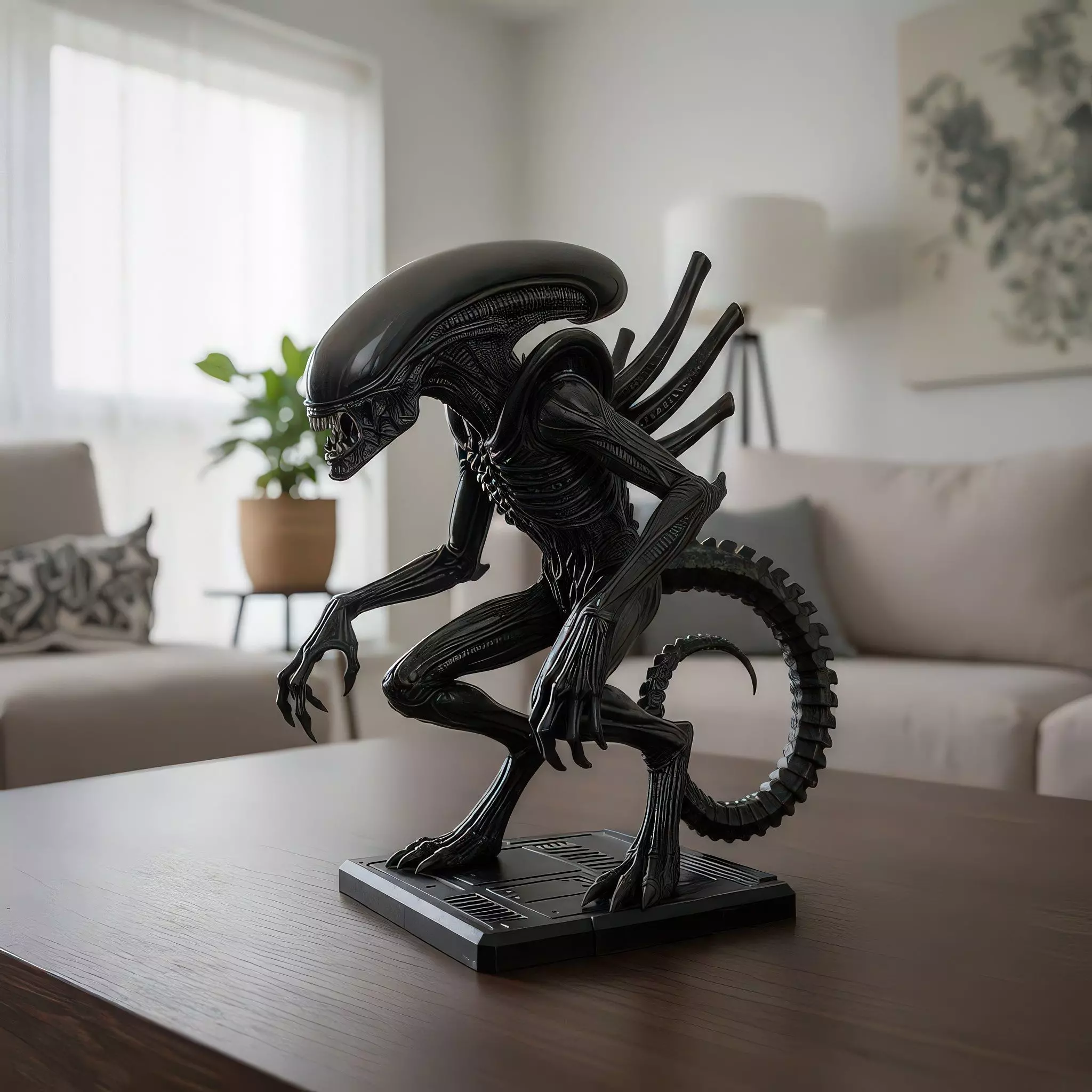 A highly detailed xenomorph‑style alien in a stalking pose on a sci‑fi deck plate base, featuring the iconic domed skull, ribbed exoskeleton, dorsal tubes, and a segmented tail curled for balance. Ideal for sci‑fi and horror displays or dioramas.