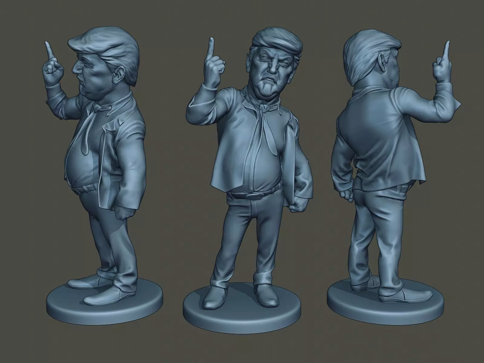 Blender 2.8Format:STL fileOBJ file--------------------Description:Model of Trump for 3d print. High details. Model with a circular base.¡WARNING! VERY COMPLEX MODEL FOR PRINTING!IT IS LIKELY THAT THE MODEL DOES NOT GO WELL BY THE AMOUNT OF PARTS AND DETAILS.ARE YOU ABLE TO PRINT THIS MODEL?Materials: Standar