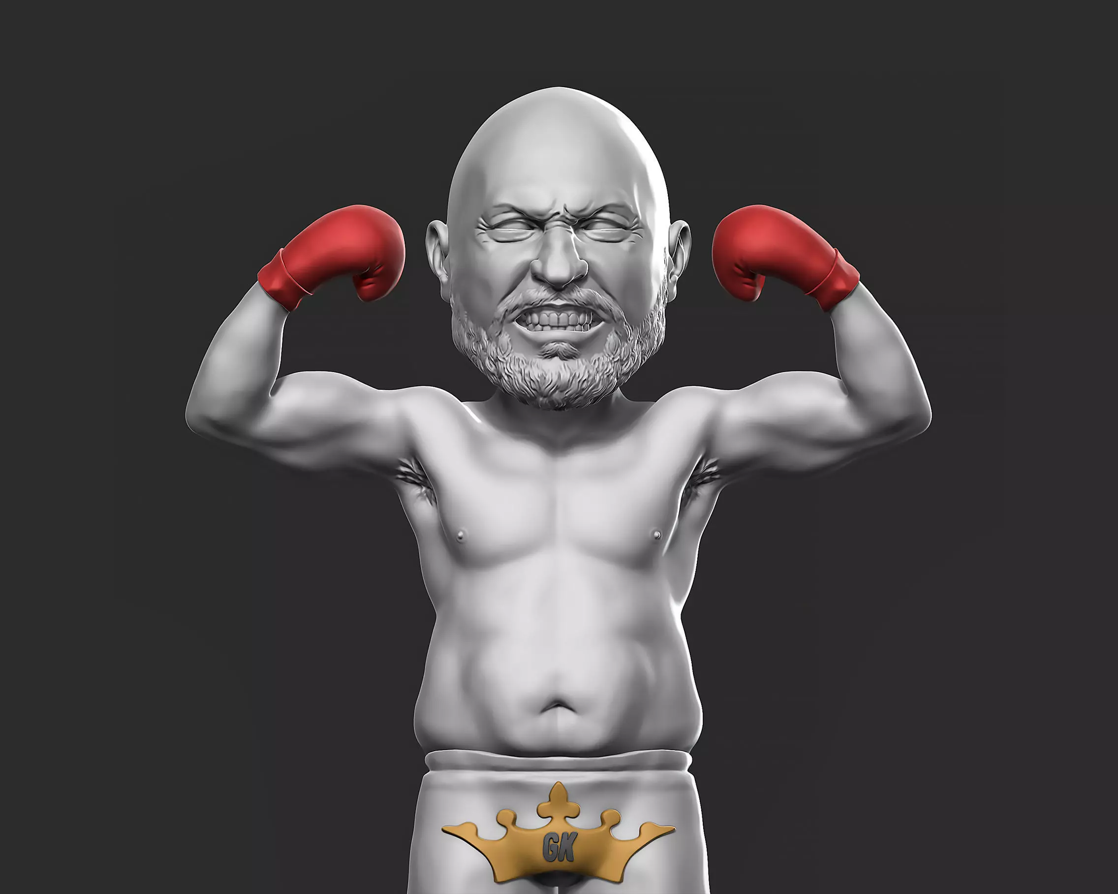 Get ready to meet the true star of the ring in a satirical twist! This 3D model of Tyson Fury captures him in a moment of triumph: flexing his biceps with an intense grimace that shows off his teeth—pure charisma. The oversized head adds an extra touch of charm, and the crown on his trunks reminds everyone who the real king is.