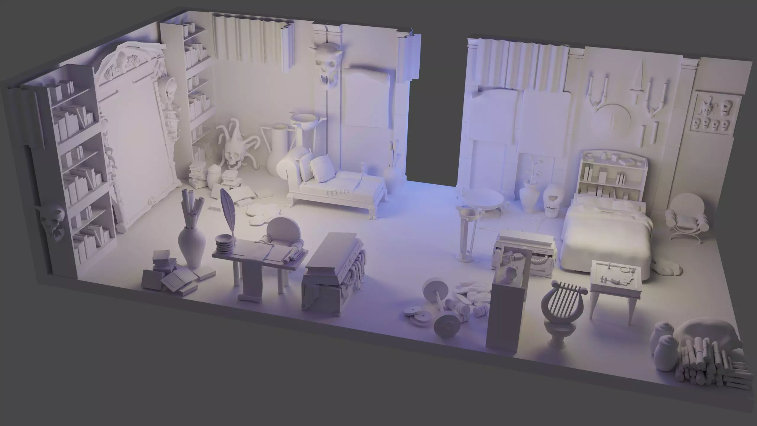 Bring the ancient Greek underworld to life with this 3D model pack of Zagreus' bedroom, inspired by the hit video game Hades. This pack contains STL files for 3D printing, including detailed furniture, decor, walls, and floor elements. Perfect for enthusiasts, collectors, or anyone looking to recreate this iconic scene in physical form. The models are optimized for easy printing, making them ideal for custom dioramas, display pieces, or game props. This Complete Pack contains all of the models needed to fully recreate Zagreus' room. We also sell individual pieces of the room decor in packs, but this pack is the only way to get the walls and wall-based decor.
