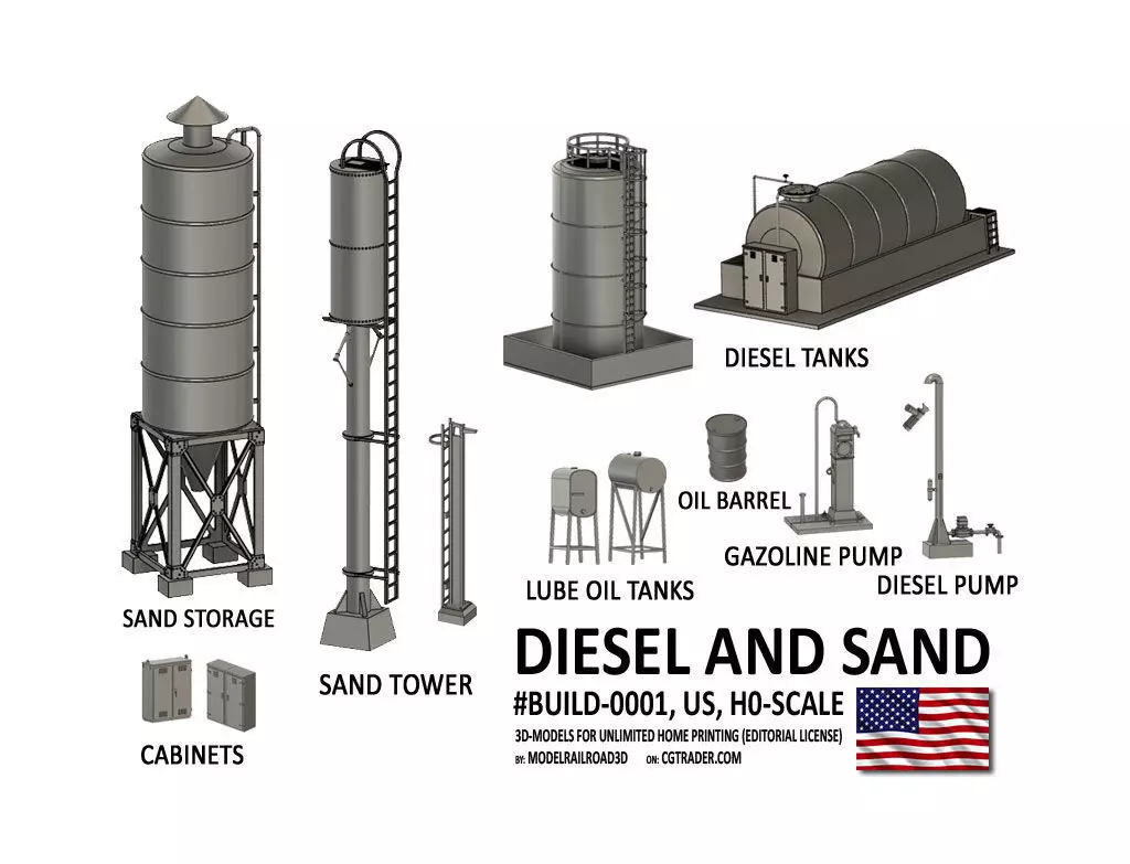 Diesel- and sand filling detail set. The set includes both horisontally- and vertically placed tanks, as well as the pump house and diesel filling equipment for locomotives and smaller gazoline powered vehicles.
