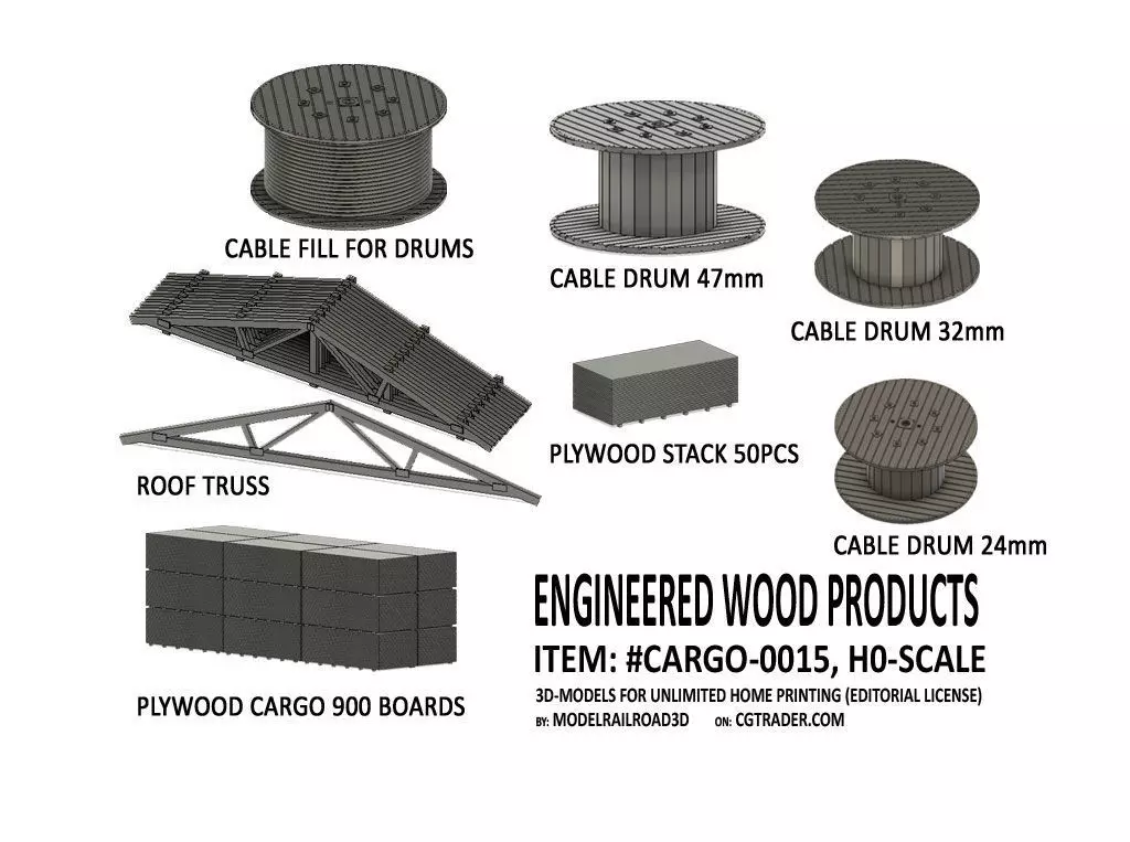 Engineered Wood Products set in H0-scale intended both for decoration inside and outside ware houses, loading docks and on open freight cars.Ready-to-print super detailed items set for H0-scale Model Railroad. The 3D-models with supports for resin print are included and all neccesary preparations are made to simplify print. Simply download, un-zip, slice and print. Enjoy!