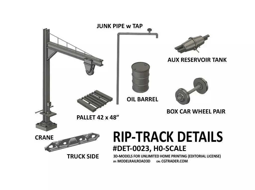 Super detailed 3D-models of RIP-track (Repair-In-Place) detailing. Perfect for your US-themed Model railroad in H0-scale.Ready-to-print super detail items set for Model Railroad in H0-scale. All neccesary preparations are made to simplify print. Simply download, un-zip, slice, save to USB and print. Enjoy!