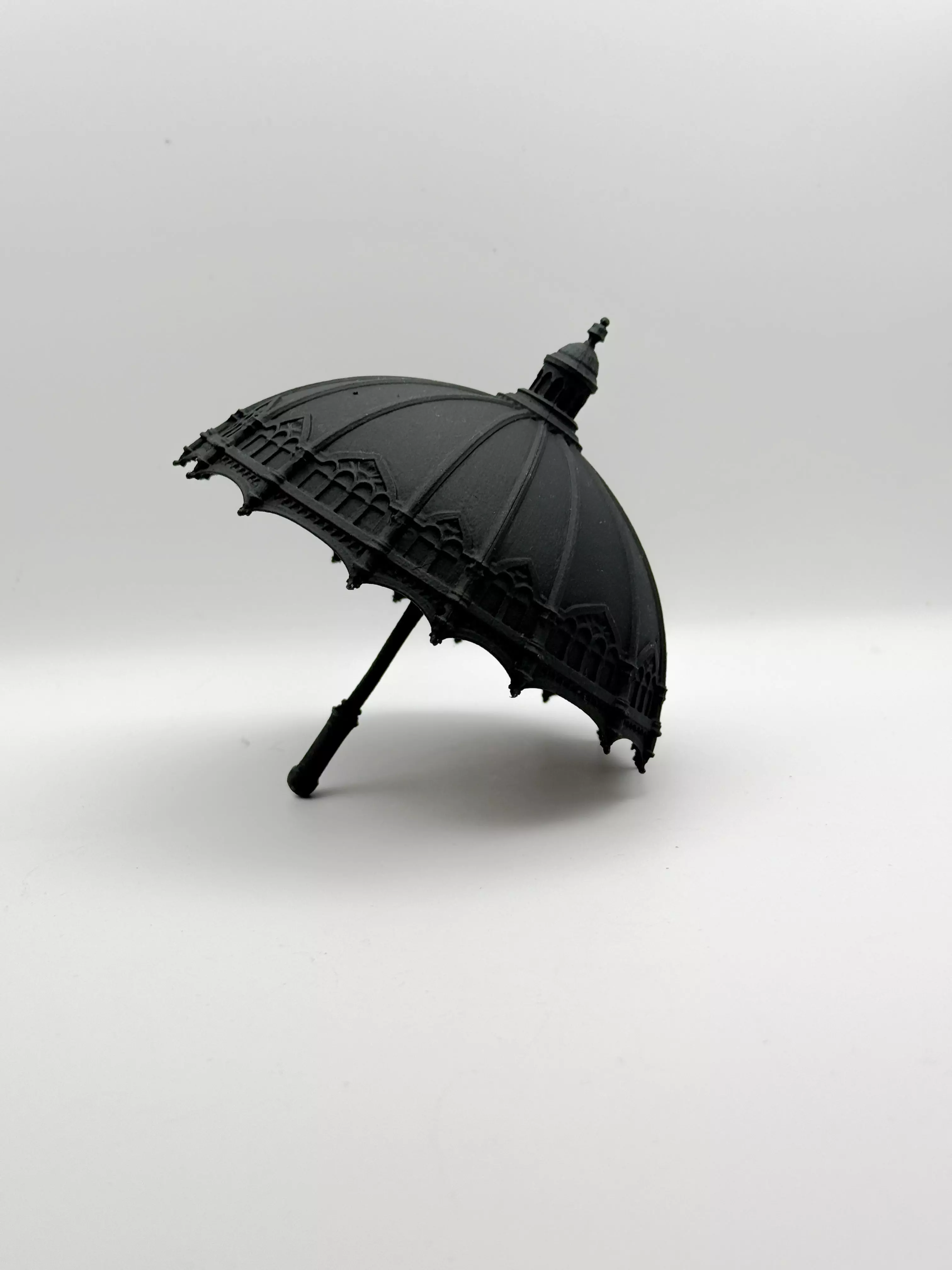 Gothic architectural umbrella is designed specifically for dolls, collectible figures, and miniature display scenes.