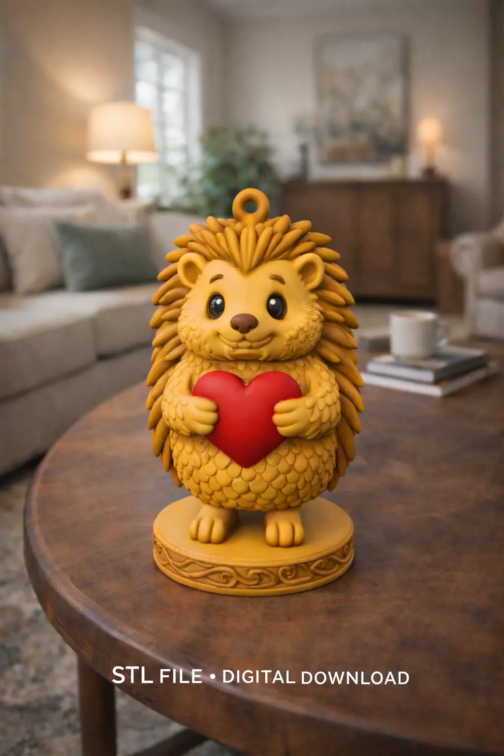 3D model descriptionThis STL features a charming hedgehog standing on an ornate round base while gently holding a heart. The sculpt preserves all original details: layered spines, sculpted facial fur, tiny paws, claws, textured belly, and decorative pedestal. A built-in top loop makes it suitable as a pendant, keychain, ornament, or small display figurine.
