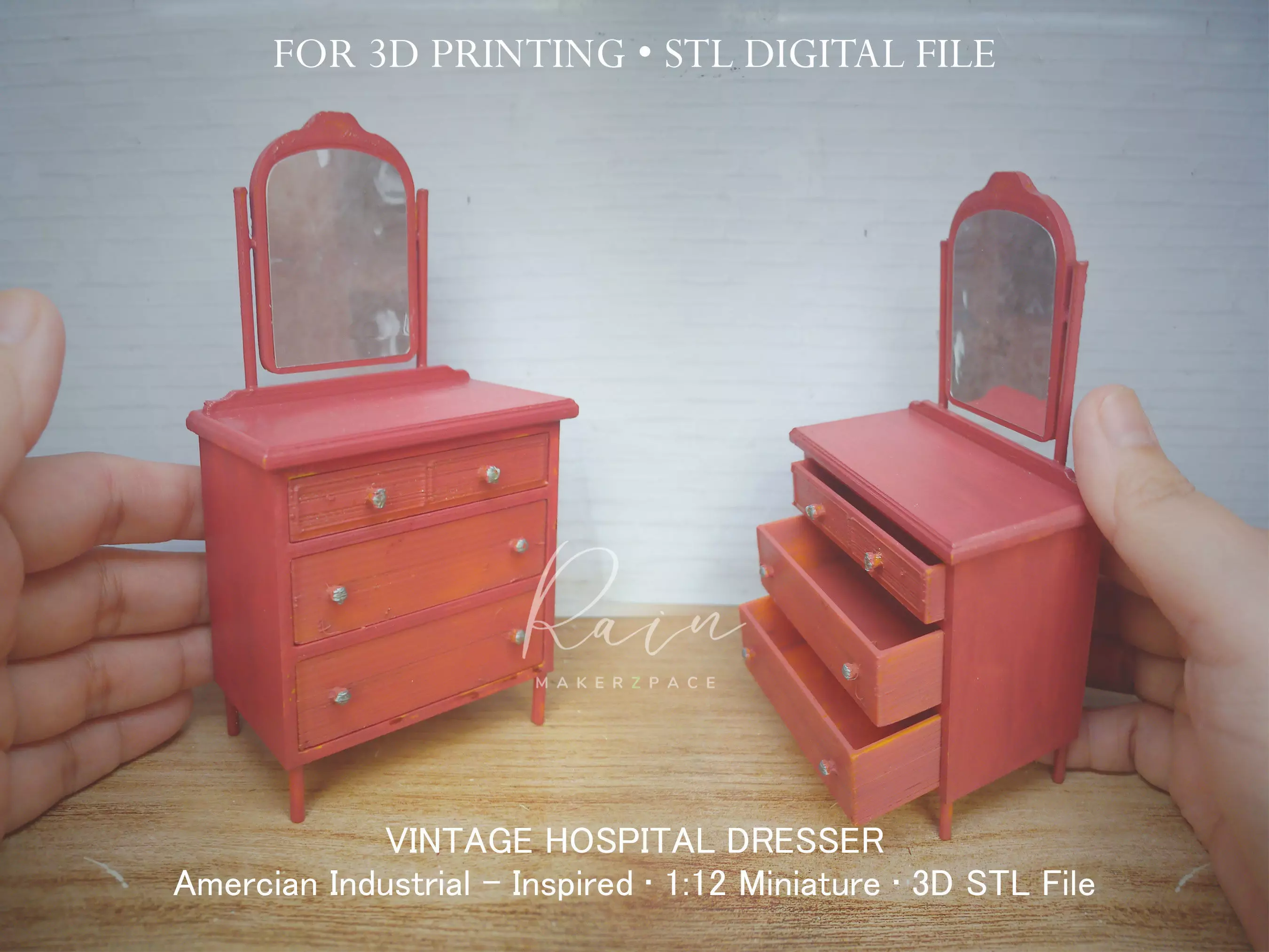 Inspired by the timeless 1930 American Industrial Simmons Metal Dresser.Perfectly scaled at 1:12 to seamlessly fit your miniature world.Ideal for recreating the historic ambiance of a bygone era.Functional DrawersMirror can be tilted with careEager to complete your miniature hospital room with this classic dresser? Download the design now and 3D print your very own miniature hospital dresser to elevate the authenticity of your nostalgic scene.