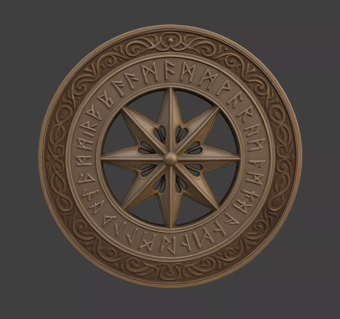 A detailed circular rune-inspired decorative disk featuring a central eight-point compass star surrounded by engraved runic symbols and ornamental border detailing.