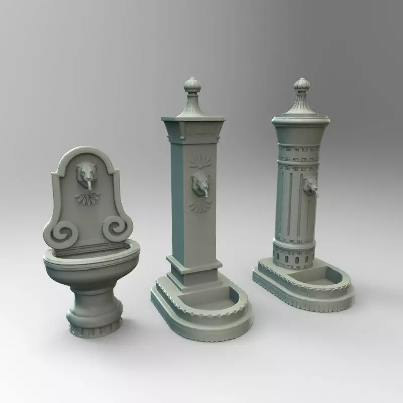 Public Fountains (3 types) - 1-35 scale diorama accessory - High quality 3d printable 1/35 scale accessory for your miniaures and dioramas project. This 3d model was designed for resin 3d printing technology. Private Use Only You can change scale and print the files for your personal use only. You can post images or impressions on other media. You CAN'T sell, distribute, share them both the digital or 3D printed version. You CAN'T use them for any sort of mass production of any kind. You CAN'T share the files with other people or on any web platform. You CAN'T make a profit of any sort using the files. No Derivatives. For commercial or other use please contact me with a PM