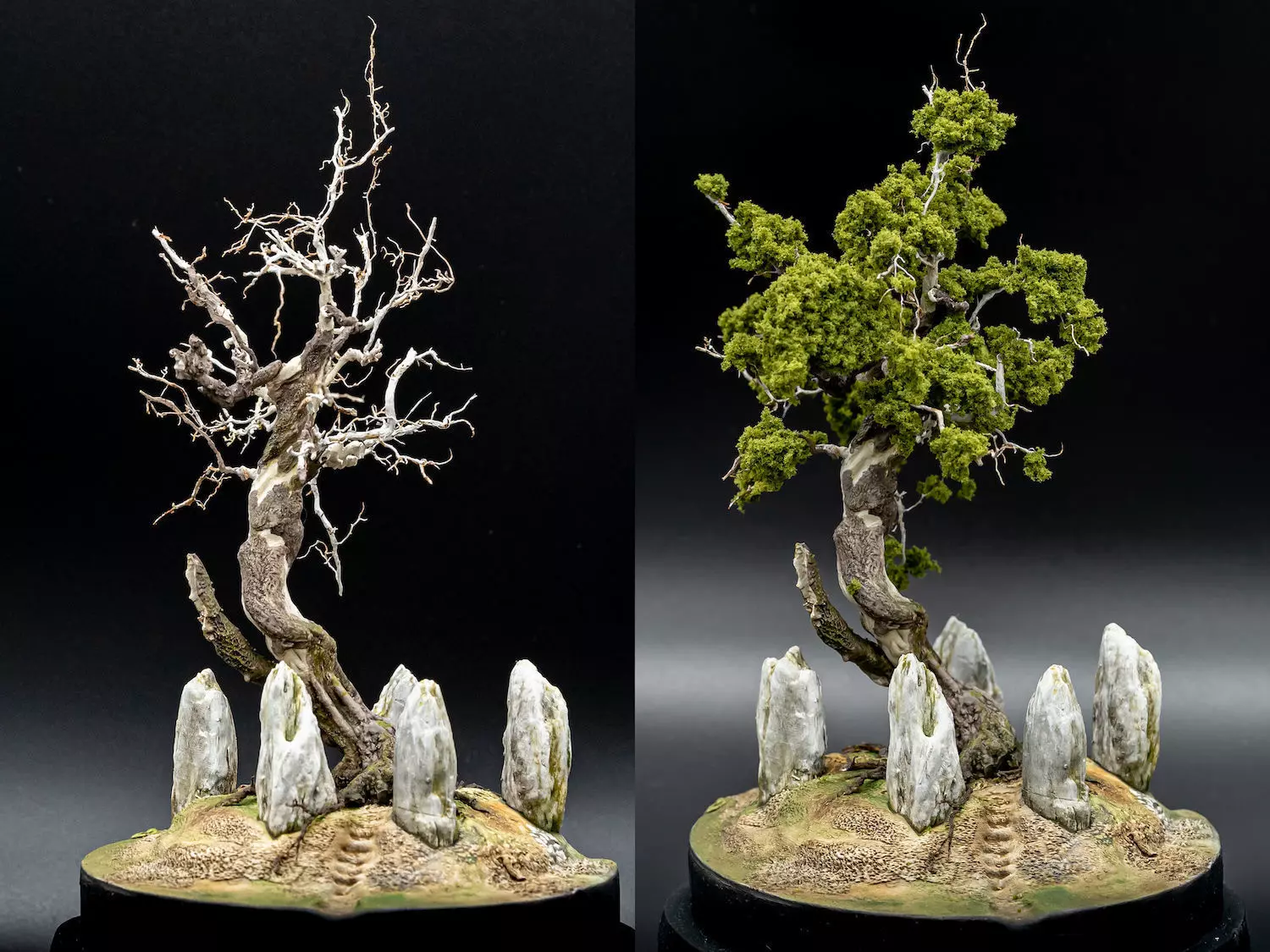 Landscape detail on a round, highly textured base showing an enchanted stone circle over which a huge old tree towers. You can use the model to embed it into a biggeer diorama of your own, create a diorama with it or use it as a piece of landscape in a tabletop game.