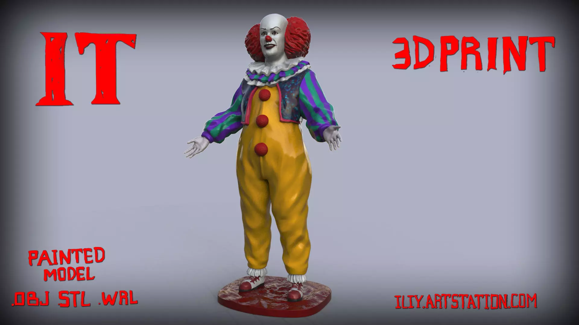 Hey! I'm pleased to present you stylized painted high poly PennyWise 3D model based on Stephen king's IT movie (Penny wise performered by Tim Curry) 1990