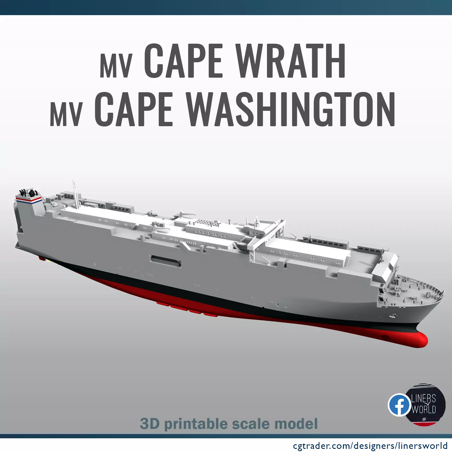 A detailed and accurate model of the Ready Reserve Force ships MV Cape Wrath or Cape Washington, identical sister ships, optimized for resin printing at a 1/1000 scale basis. The model is easily printable at both larger and smaller scales. Both full hull and waterline versions are included.
