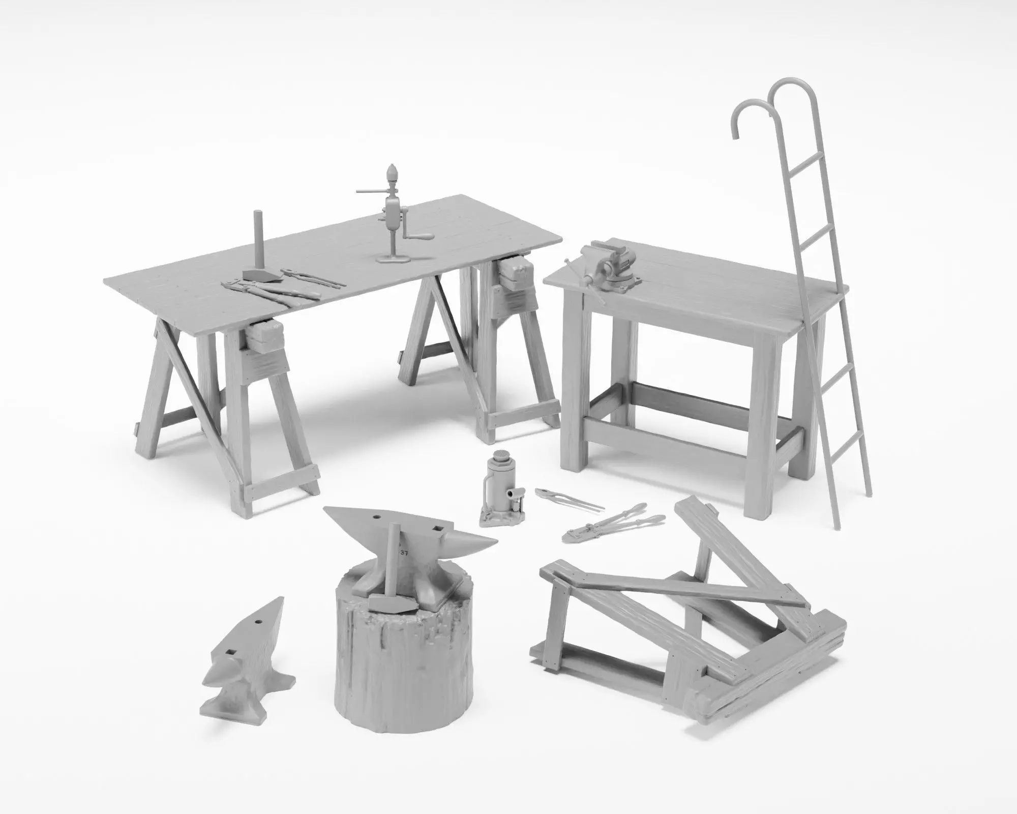 In this pack, you'll find an array of workshop diorama essentials. It includes workhorses with an optional worktop for versatile use, a small workbench complete with a bench vise offered in two versions – one with securing bolts for bench mounting and one without.