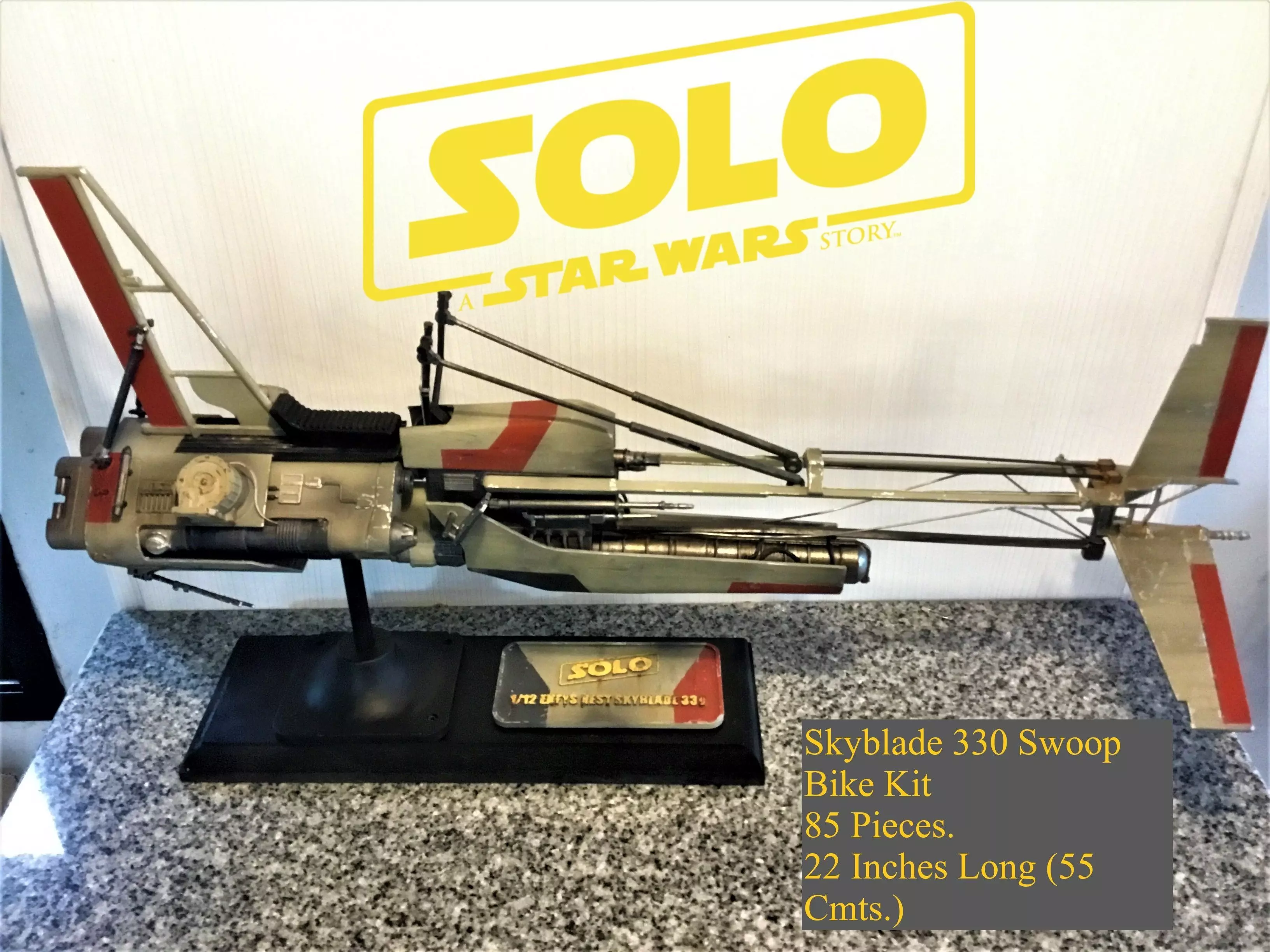 This is the Enfys Nest Skyblade 330 bike from Han Solo movie, it is designed as a kit to assemble, it contains 85 pieces and the scale, as it is in the STL files is 1/12 , 21 inch long ( 55 cmts), it is very similar to the size of the black series.. It requires a certain level of knowledge in the assembly of scale models, some pieces will require a bit of sanding to fit due to tolerances. I do not have an assembly manual, but the kit design makes the assembly quite straight. The only pieces that are missing are the cables that run along the sides of the vehicle because it would be much more convenient to imitate them with real ones .