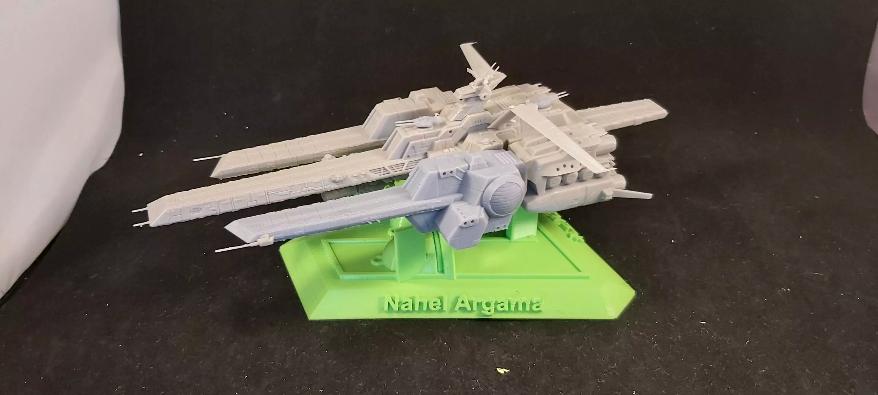 This is the 1/1700 Nahel Argama from Gundam Unicorn. She's a big ship, but has been broken down to fit on a Mars-sized printer, however, if you have a larger printer there are optional parts to make assembly simpler. I do recommend making the stand on an FDM printer due to the size of that part. Tip, make more of part E1 than you need, those parts tend to brake during assembly.