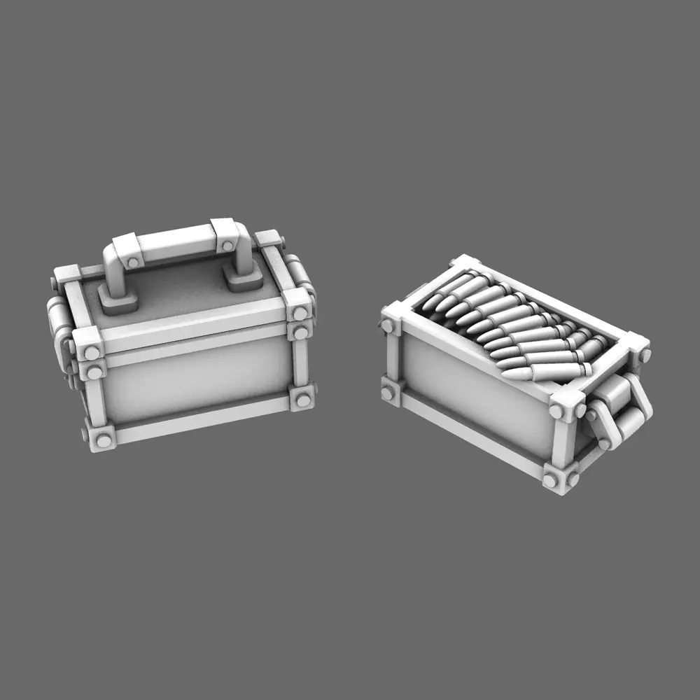Check out our BWTF Scenics Ammo Boxes. These come with intricate 3D designs that make painting a breeze. This product features 4 variations. There are three closed versions with handles in different positions, and one is open with an ammo belt. This product is suitable for your favorite 28mm-scale Grim Dark-themed Superhuman Armored Warrior of Humanity models, such as a Battle Brother Master.