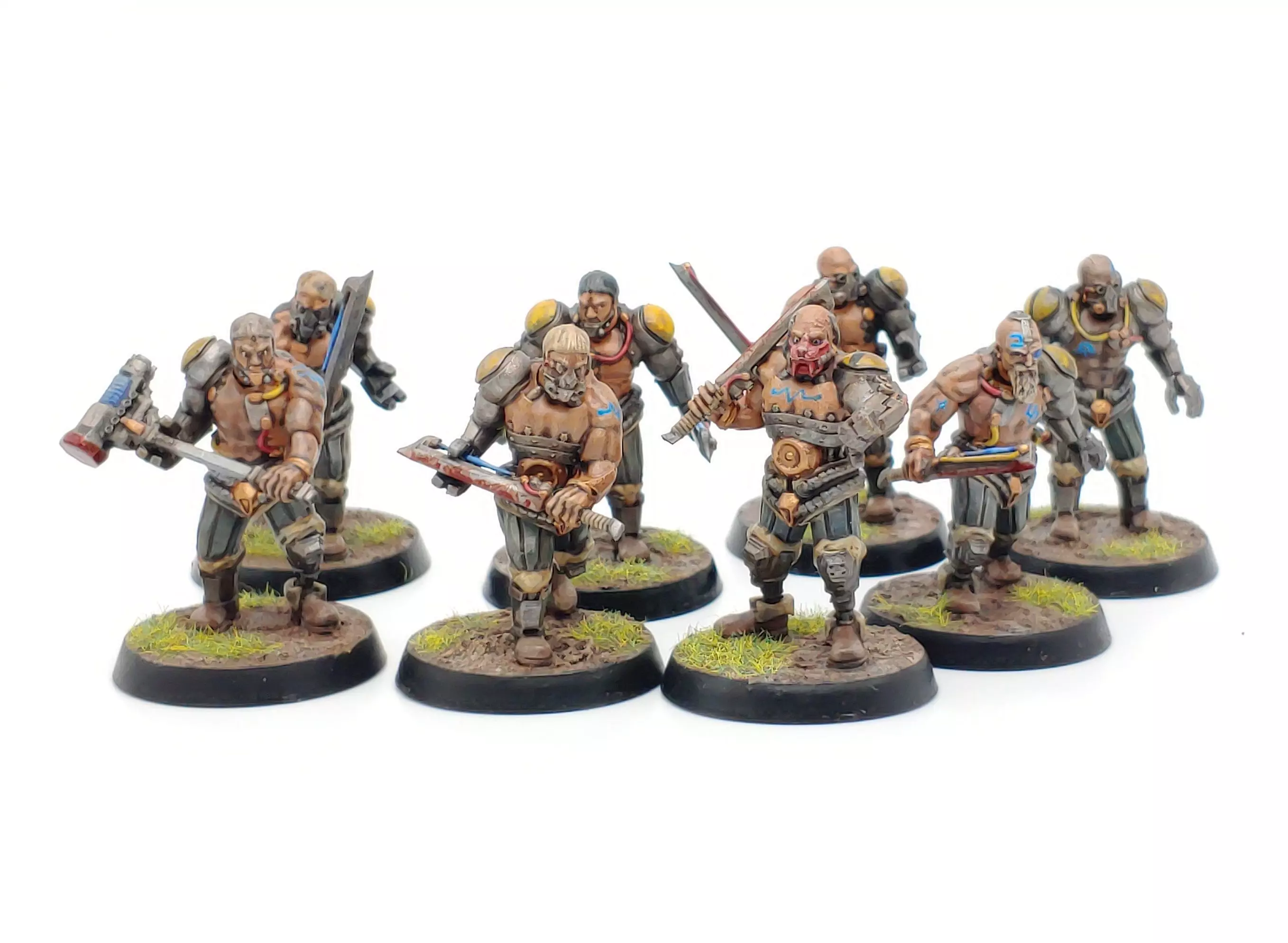 The Cyberzerker clans are some of the toughest wastelanders in the Great Terrin Basin. Their halmarks are advanced bionics, genome modification and liberal use of nanite and combat stims whose recipies have been passed down for thousands of years. Bulkers are the heavily augmented remnants of injured shock troopers. They are subjected to extensive mechanical rebuilding, strength boosting, and sent back into the fray as short lived assault units.This kit contains all you need to build a squad of bulkers. Each comes with the option for hammers or blades.
