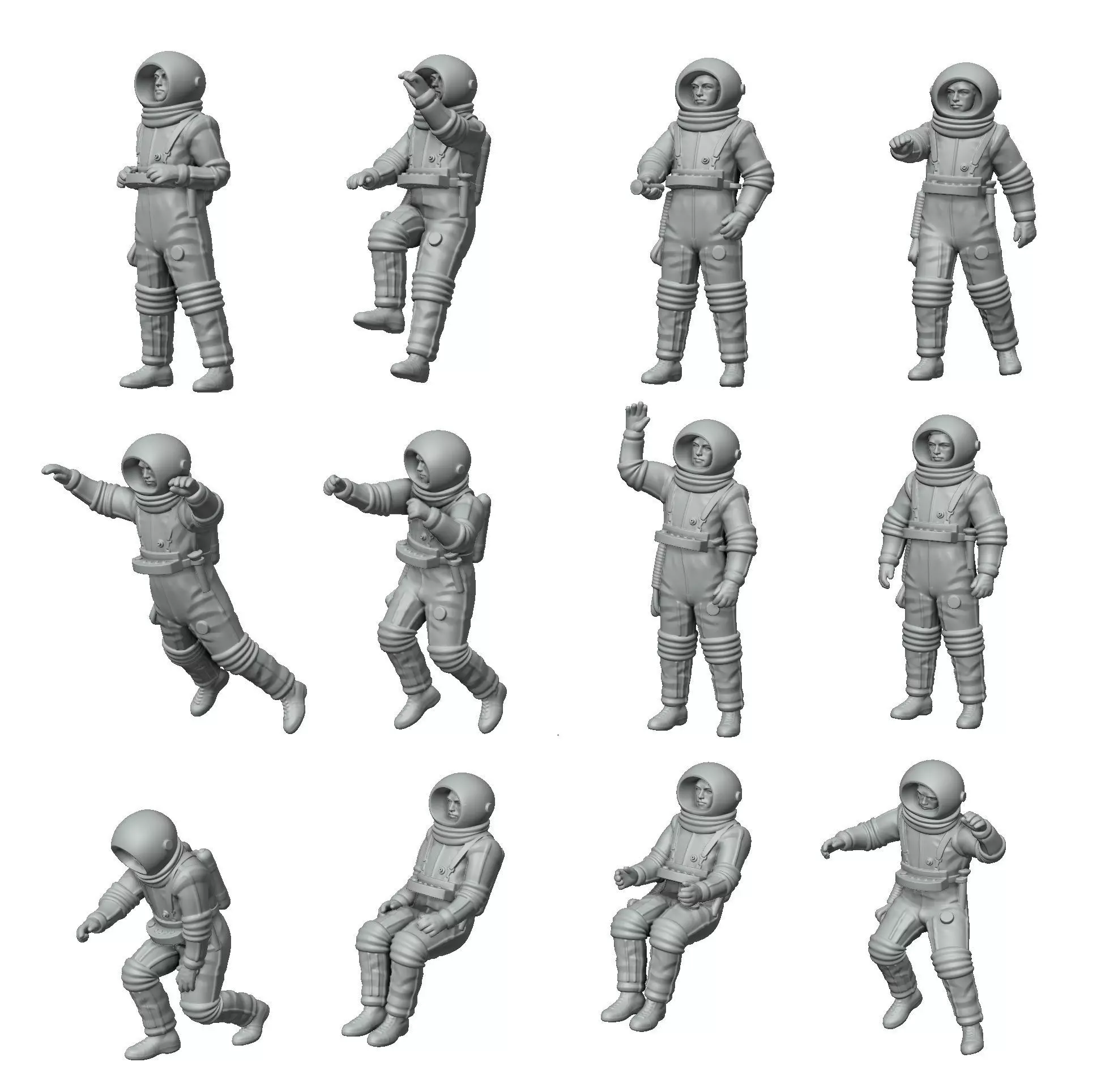 This 3D figure set adds authentic astronaut characters to classic plastic model kits, inspired by early space exploration visions.