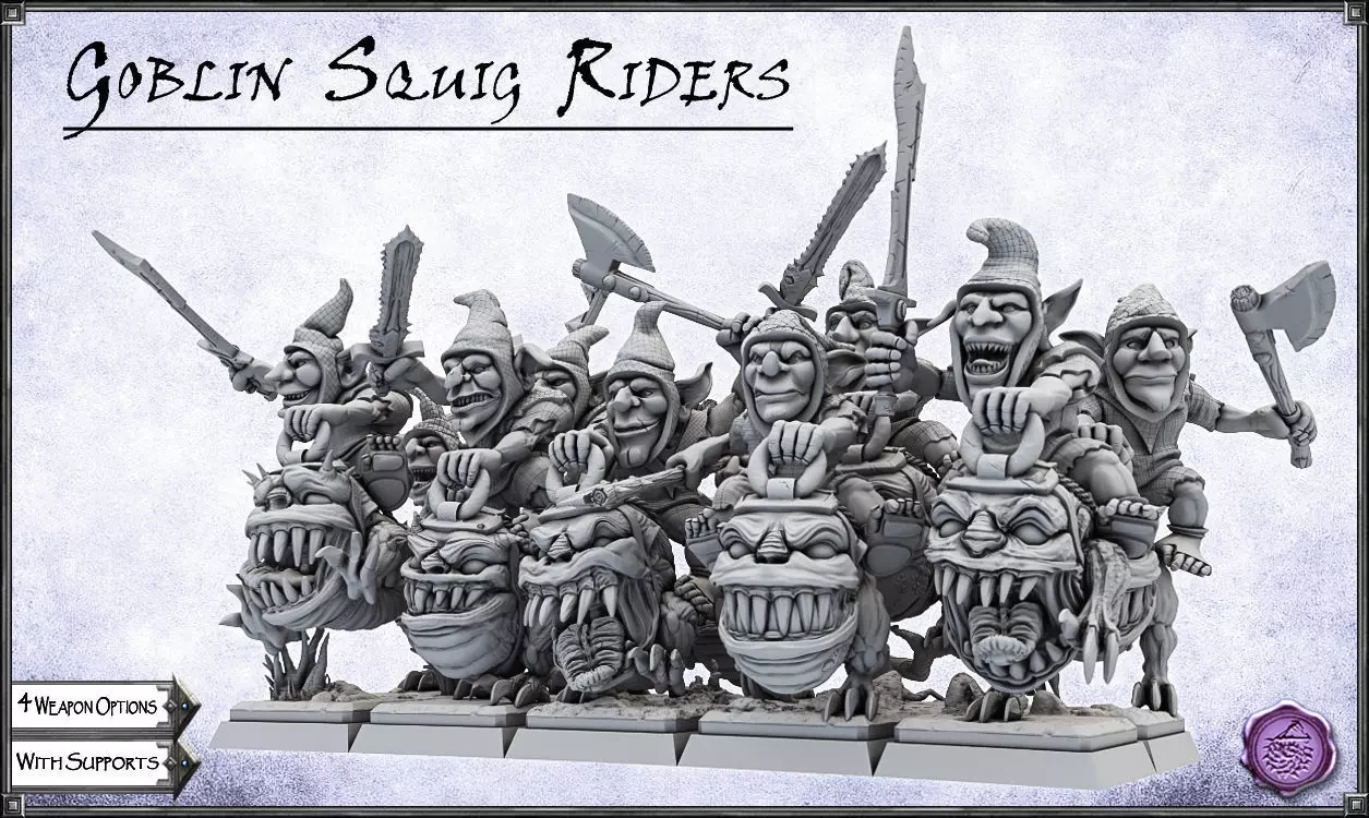 The goblin squig riders printable unit in 3D is shown with a formation of 5x2 miniatures of 20mmx20mmx3mm. ( with four different equipment options)