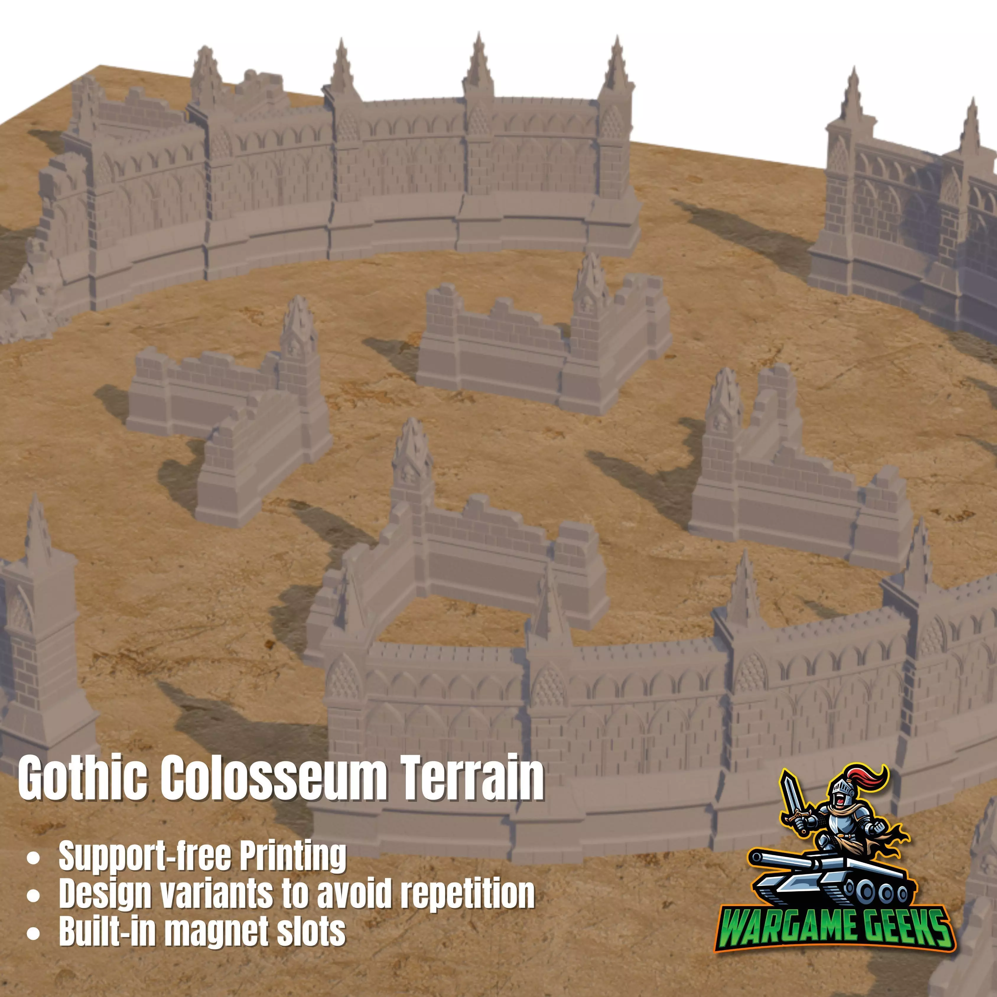 Tall Wall Segments in multiple lengths (short, medium, long)Wall Extenders for flexible assembly, including columned and non-columned variantsDamaged Wall Section with a broken column – perfect for storytelling momentsStandalone Short Wall Columns for use as scatter terrain or coverInterior & Exterior L-Shaped Walls (4 of each)Built-in magnet slots (5x1mm) for easy storage and snap-together constructionDesigned with FDM printing in mind, the Gothic Colosseum is optimised for support-free printing and includes part sizes to suit a wide range of print beds. No matter your setup, you’ll be able to create imposing terrain that fits your space and style.