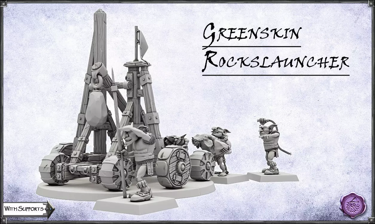 The rockslauncher is included in the army of orcs and goblins, commonly composed of goblins, an orc foreman may also appear.