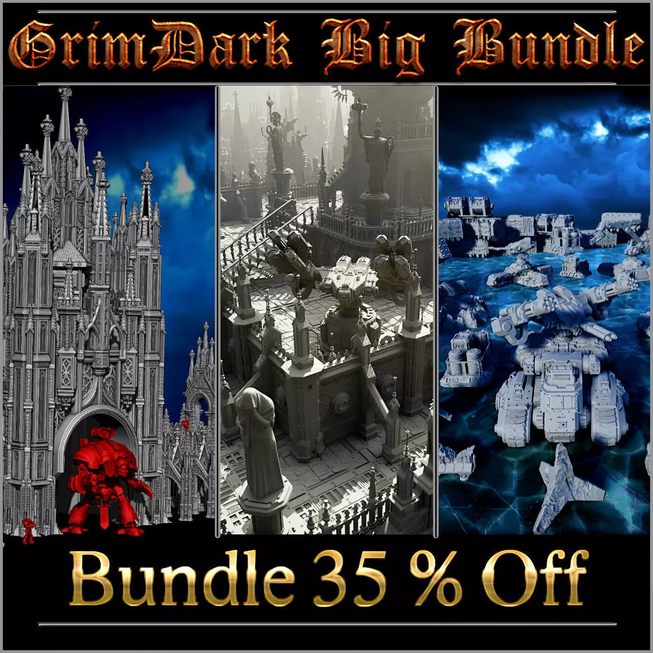GrimDark Big Bundle offer highly detailed .STL files (Personal and Commercial Use) for 3D printing. This set you can easily use with miniatures that are 28-32mm scale (cyberpunk, grimdark, sci-fi tabletop wargames). You can print up to higher size due to its detail. Each element can be print on FDM/ Resin printer (files are not Pre-Supported).