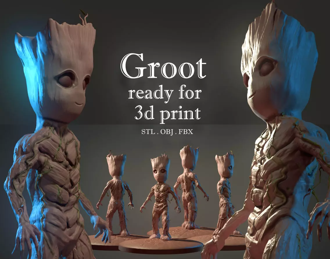 This 3D model is a printable version of a character called Groot, one of the Guardians of the Galaxy. The model is designed to be printed using a 3D printer, and can be used for various purposes such as decoration, collection, or as a gift for fans of the Marvel universe. The model is designed with high attention to detail, including the character's distinctive features such as the tree-like texture, the expressive face, and the detailed clothing. The model is optimized for 3D printing, with the appropriate thickness and structural support for easy printing and assembly. Overall, this 3D model is a high-quality and accurate representation of the beloved character Groot, and is sure to be a hit among fans of the Marvel universe and 3D printing enthusiasts alike.