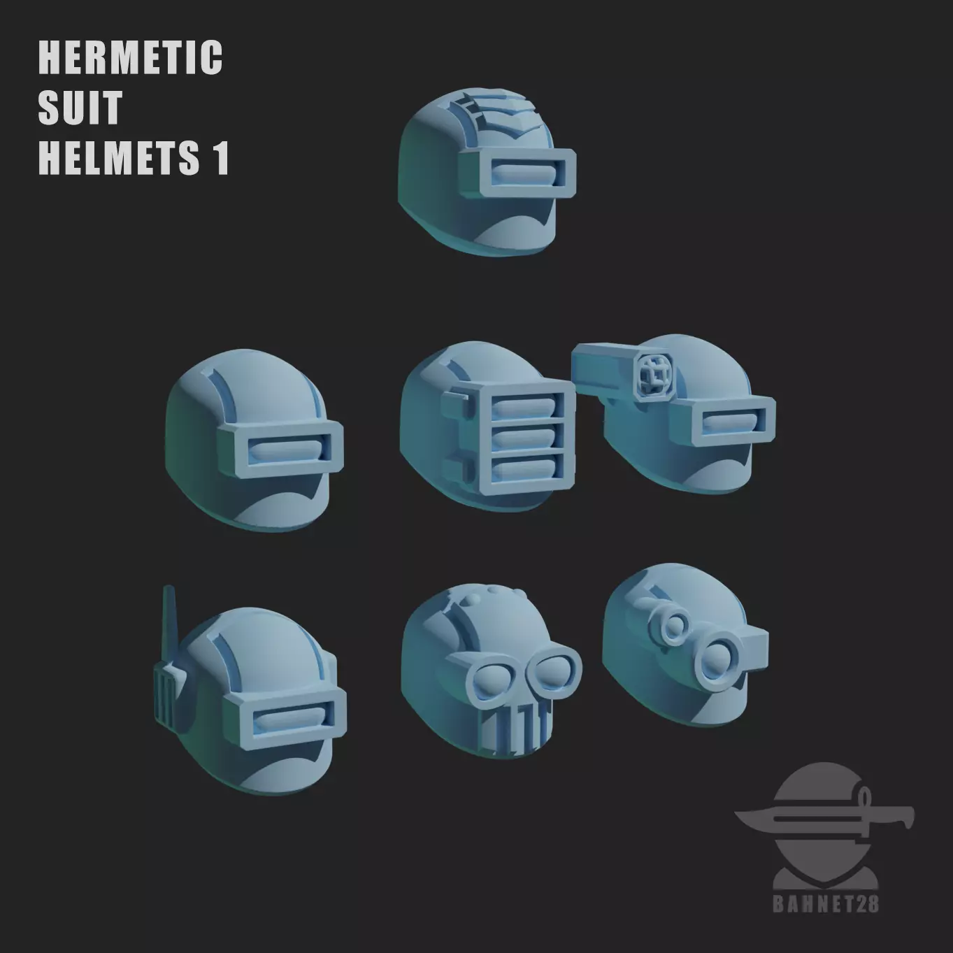 Custom helmets for 28mm scale miniaturesMade for miniatures that have a neck or a gorget that fully covers the neck (vintage diving suits, retro space suits, void suits, etc.)Bulky and thick, they'll be a fine addition to your heavy infantry or retro-themed army