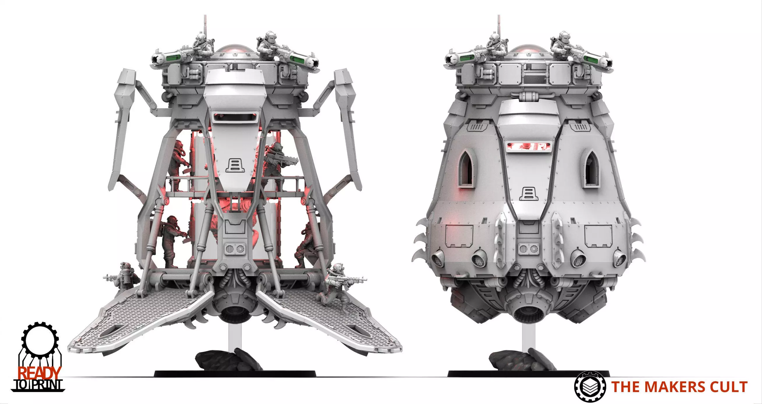The Exopod is a mobile fortress for the Ironblood troops. It can be used, for defense, support or cloning creatures on the battlefield.This large kit includes many building options, and movable door mechanisms, as well as crew for the Exopod.Fits on a 100mm round base, using an 8mm rod for flying.All parts can be printed in Mars or Photon printers. Larger 3Dprinter is recommended thoughOverall size : about 17cm tall, 13cm diameter (closed) 27cm diameter (fully open)