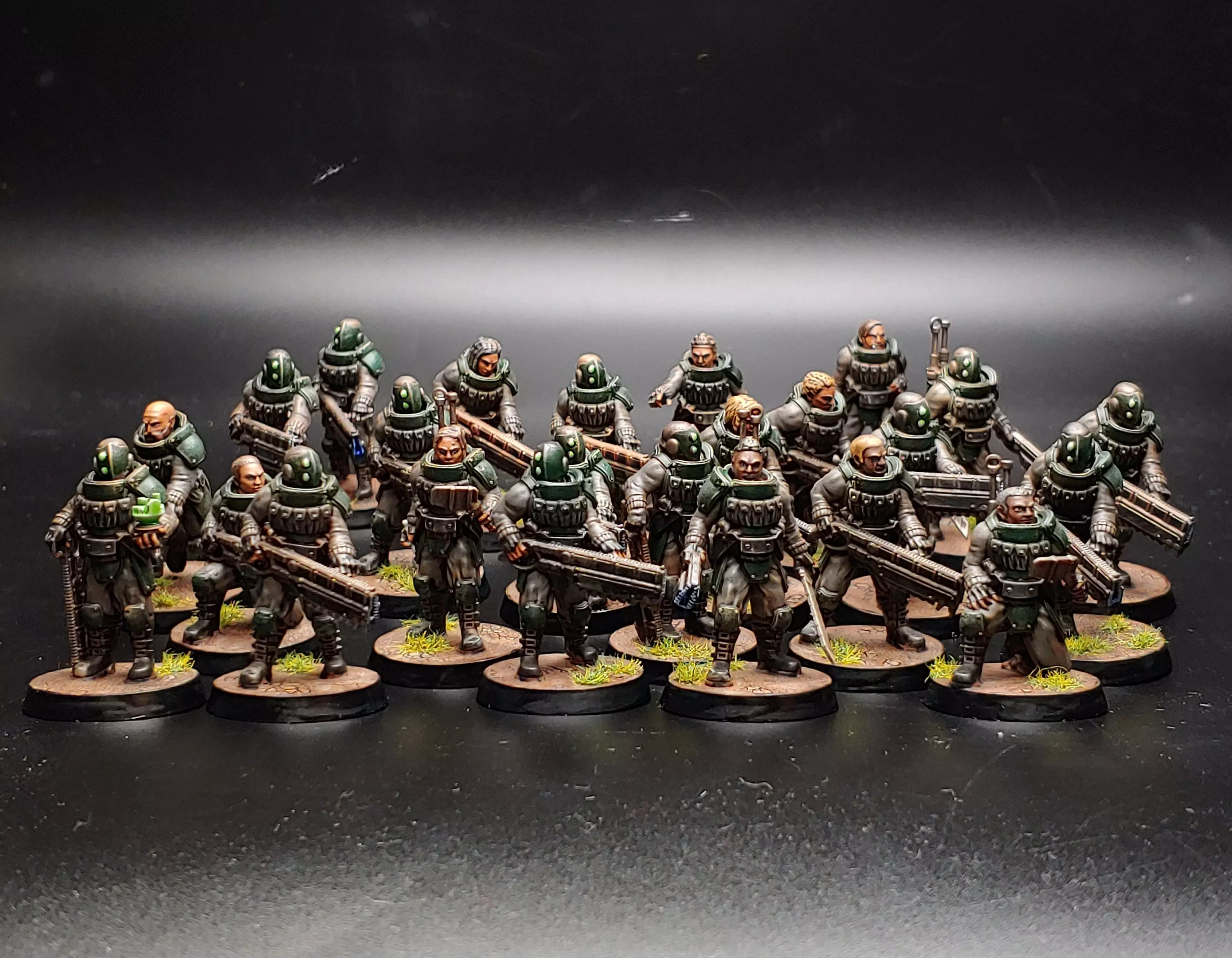 Faction Lore:The Jade Coalition are a part of the Terran Technocratic Union, A group comprised of three factions on pre-unity earth.The Coalition force is gathered from several City-States that cover the North east of the spine mountains.Primarily a mobile force they go to war with rail and coil weapons as well as the most advanced surveillance and targeting systems on Terra.The Coalition is armed and armored by mechs, hover tanks, and a variety of combat and logistic drones.During the wars of unity the Coalition acted as a mercenary force, working both for the warlord of the thunder legions and rogue technocratic enclaves. As unity became assured the coalition threw in wholly with the nascent imperium, and as the empire expanded beyond earth the Coalition forces made up a portion of the expedition fleets.As civil war breaks out across the galaxy they have reverted to their mercenary tendencies, biding their time, and waiting to see which side will gain the upper hand.