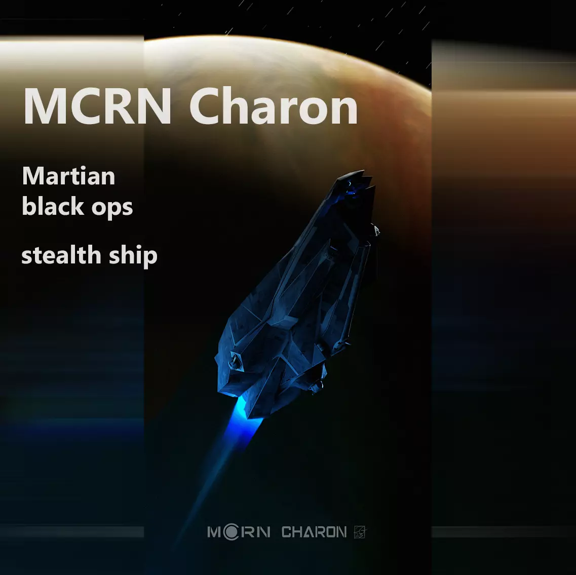 In this imaginary timeline (this is not canon, of course), the ship is an unfinished prototype from the same company (Protogen) and the same Moon shipyard (Bush) that built the Amun-Ra class stealth frigates.The Charon was the first of the Sekhmet class and was left unfinished for some reason.It was later stolen by a group of Martian operatives and brought back to the Red Planet. It was then re-commissioned as a black ops stealth ship under the name MRCN CHARON.Motivated by the death of the Donnager (...) the group gave the ship the name 'Charon' as they plan to take those who killed the Donnager to the underworld.Notes:The design is inspired by early symmetrical sketches for the Amun-Ra class by original designer Chris Danelon. It's a bit of a clumsy homage to the great work he did on the Expanse series.