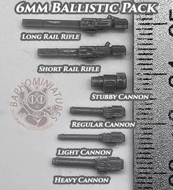 2, 4, 6 Rocket Launchers5, 10, 15, 20 Missile Tube LaunchersStub, Light, Regular, Heavy CannonSmall, Medium, Large LasersDual Small Lasers, Dual Medium Lasers, Dual Large LasersShort, Long Rail RifleShort, Long Particle Cannon