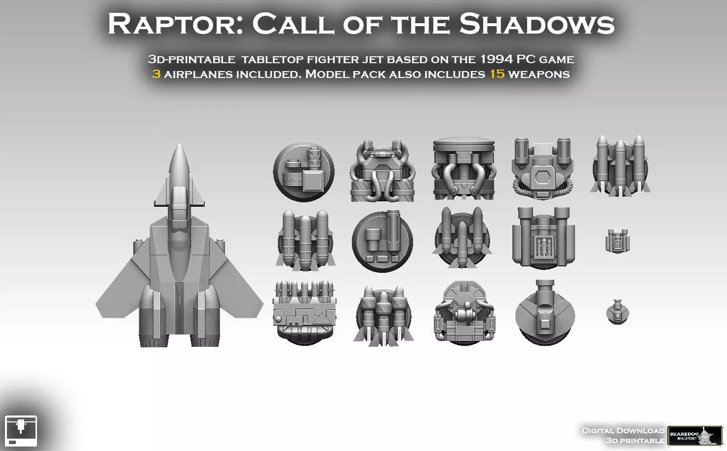 Futuristic fighter jet with an arsenal of equally futuristic weaponry. Based on the 1994 vertical scrolling game Raptor: Call of the Shadows. Model pack includes the following: