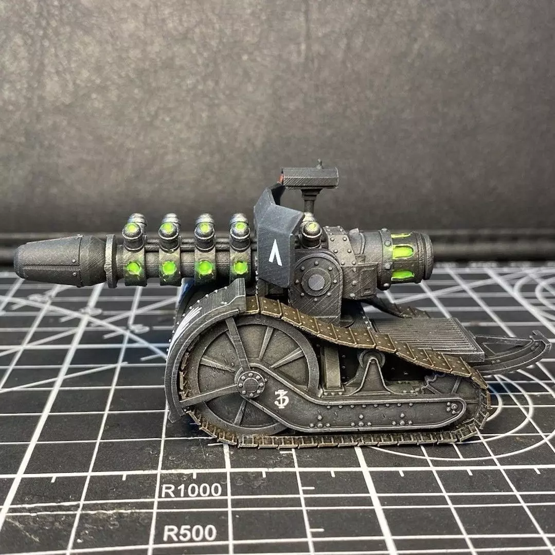 Design Notes: I created the Gravity Cannon with inspiration from a few different references/inspirations. I added a removable gravity core in the rear as well. This release includes a new and improved hull armor plate. I've removed the two supports that used to rest on the upper hull as these mostly get in the way, are unnecessary, and not visible when assembled. I've also added polygons to the curved surface and resupported at a different angle. This should produce a much smoother surface when printed.