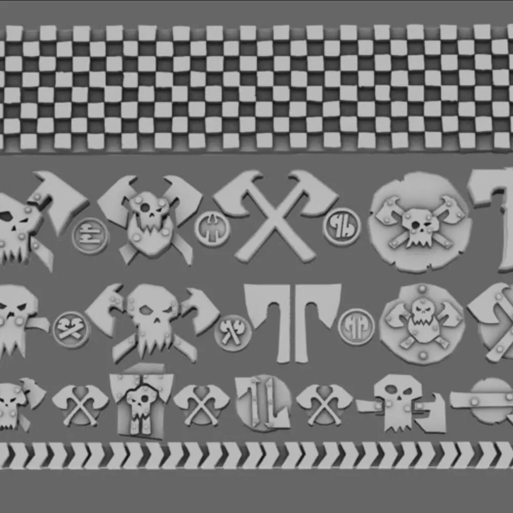 Space Orcs Metal Lads Klan Symbols set includes a variety of clan marks sized to fit all your different favorite orc-ish models and/or scenery. The set comes with a variety of different Skull and Ax style symbols. Adding these flat surface insignias provides a raised bit that makes painting easy and ensures a consistent and uniform appearance. As an added benefit, this product makes it possible to easily add these to models you’ve already painted. Simply prime, paint, and glue to ensure a clean look.