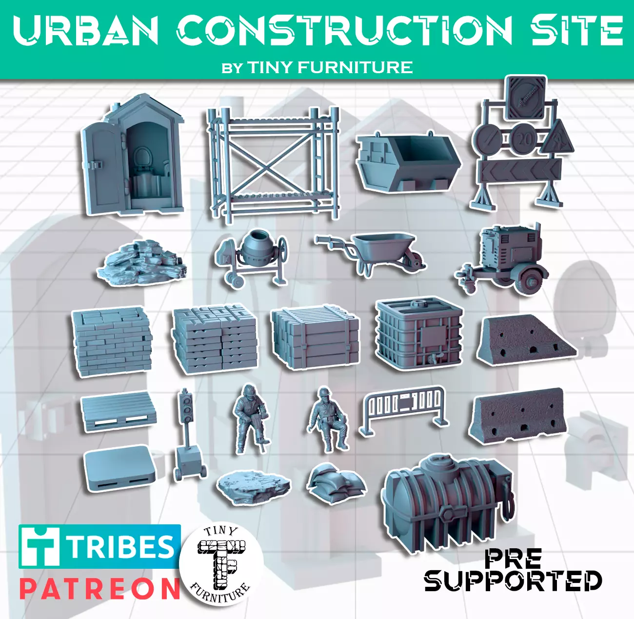 Work never stops. Someone's drilling - someone else is just watching.A full urban construction site in miniature: scaffolding, cement mixer, wheelbarrow, skip container, road signs, barriers, a portable toilet, pallets, stacked tiles, a water tank, a generator, and two workers — one actually doing his job, the other taking a very extended break.Perfect for modern and post-apocalyptic settings: This Is Not a Test, Zona Alfa, Gaslands, Fallout: Wasteland Warfare, urban Delta Green campaigns, or any city table that needs a little life (and a lot of clutter).Construction debris is the best cover on the block.