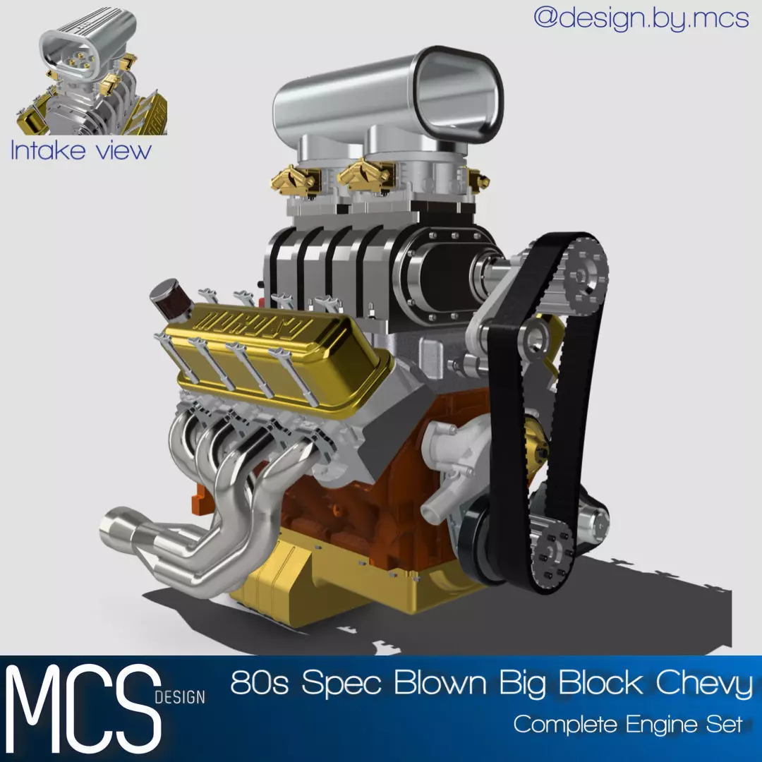 Designed from scratch is a Supercharged Big Block Chevy engine in a 1980s or 1990s style, complete with accesories, high in detail, ideal for scale modeling (currently in 1/24 and 1/25 scale).