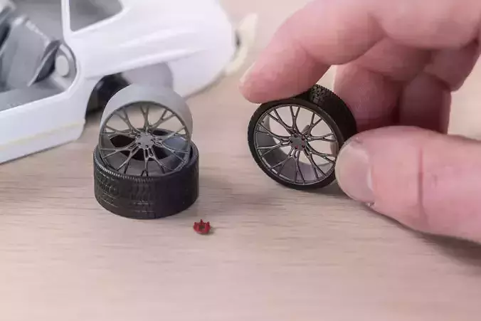 Each wheel is made up of 3 parts. The rim, the tire and the bolts to make it easier to paint.