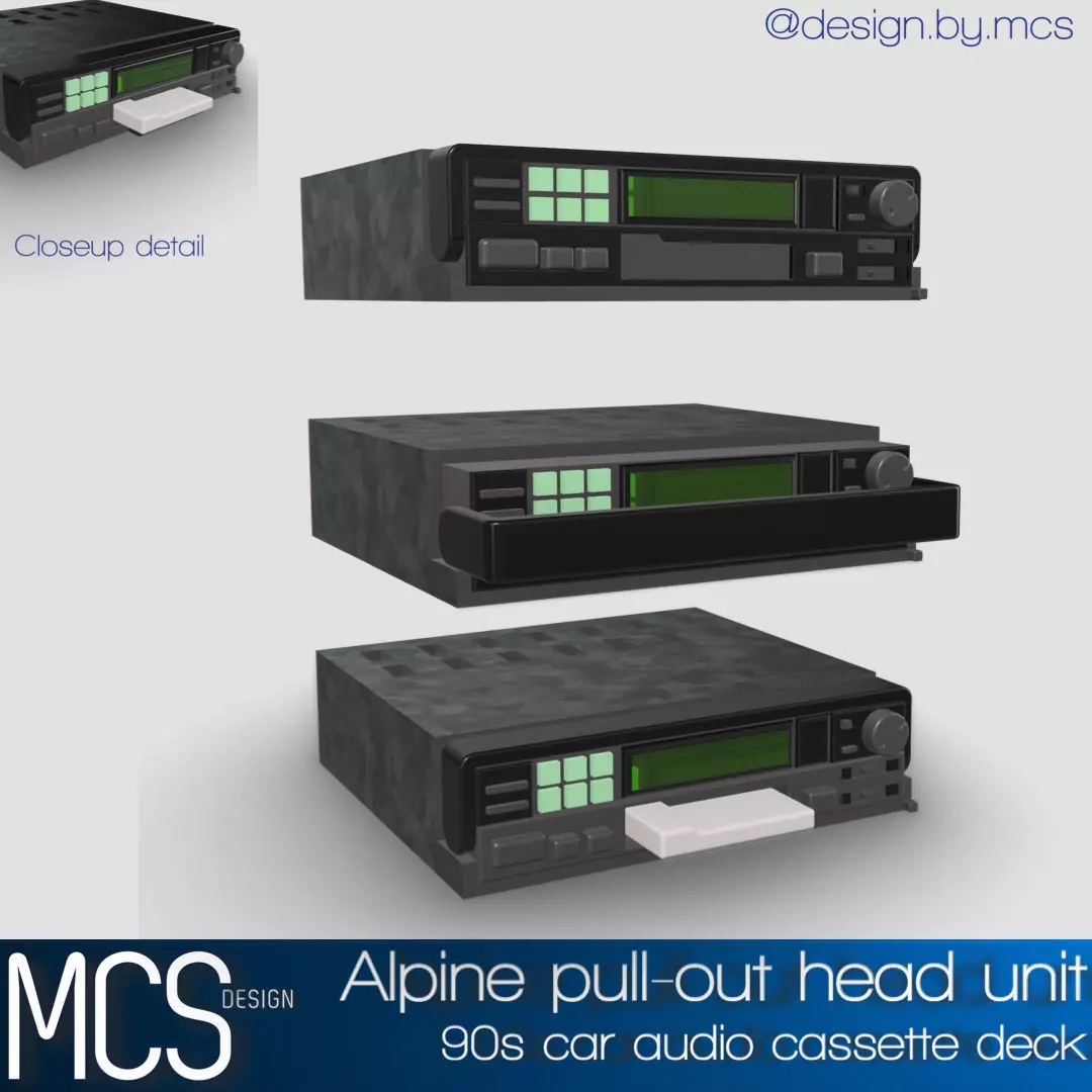 Designed from scratch is an Alpine 90s car audio casette deck with pull-out option, high in detail, ideal for scale modeling (currently in 1/24 and 1/25 scale).
