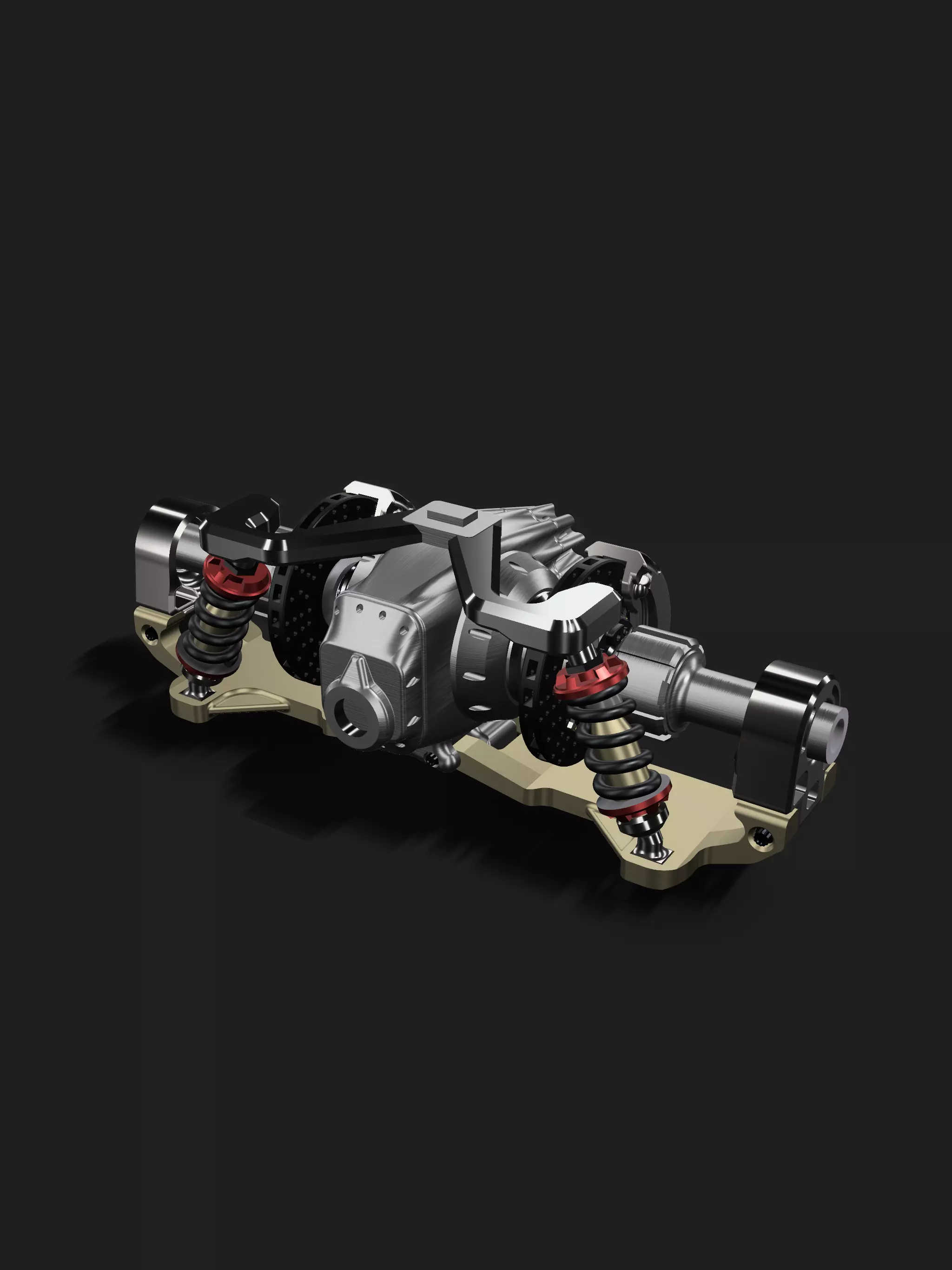 Designed from scratch is a Billet style IRS assembly, featuring a Jag style central brake style, billet Quick CHange centre assembly, coil overs and a multi link arm & hub assembly. The design has a mix of visible & recessed bolts where the sections connect, high in detail, ideal for scale modeling (currently in 1/24 and 1/25 scale).