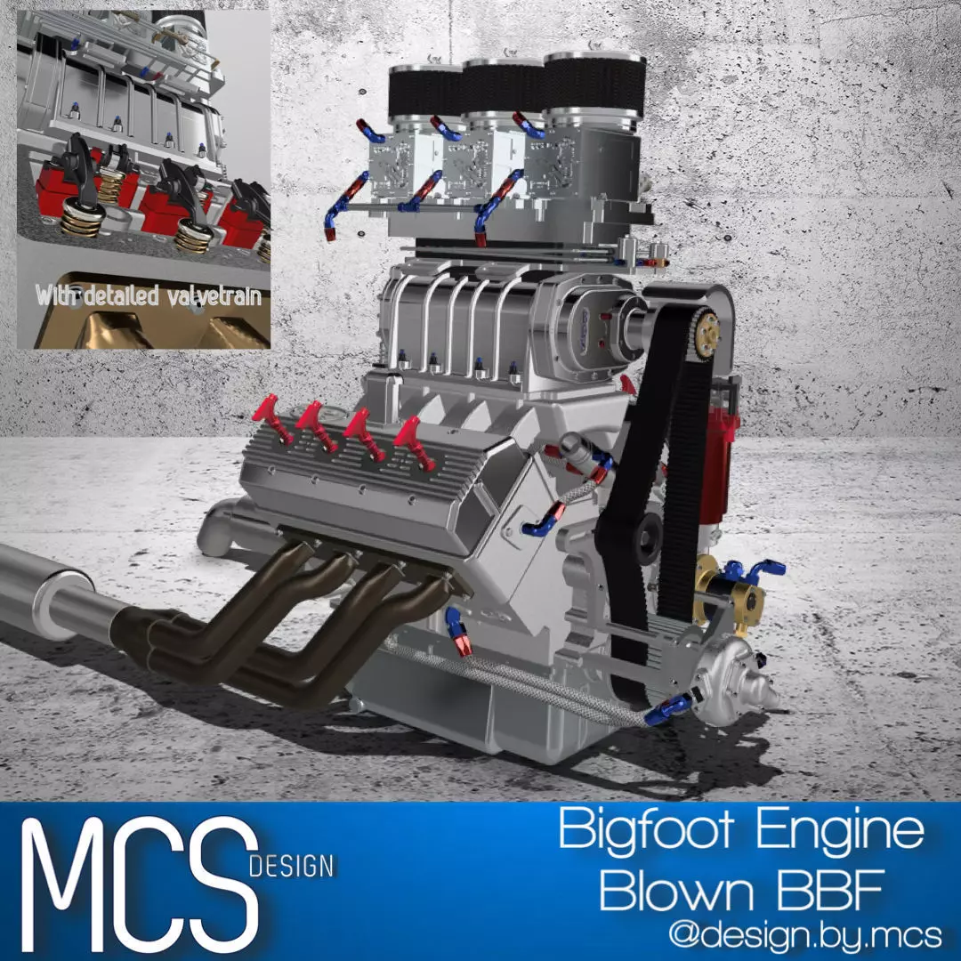 - Heads: hollow heads for simple printing, and detailed heads complete with Bigfoot customized valvetrain details. Left & Right sides have unique locators in the block