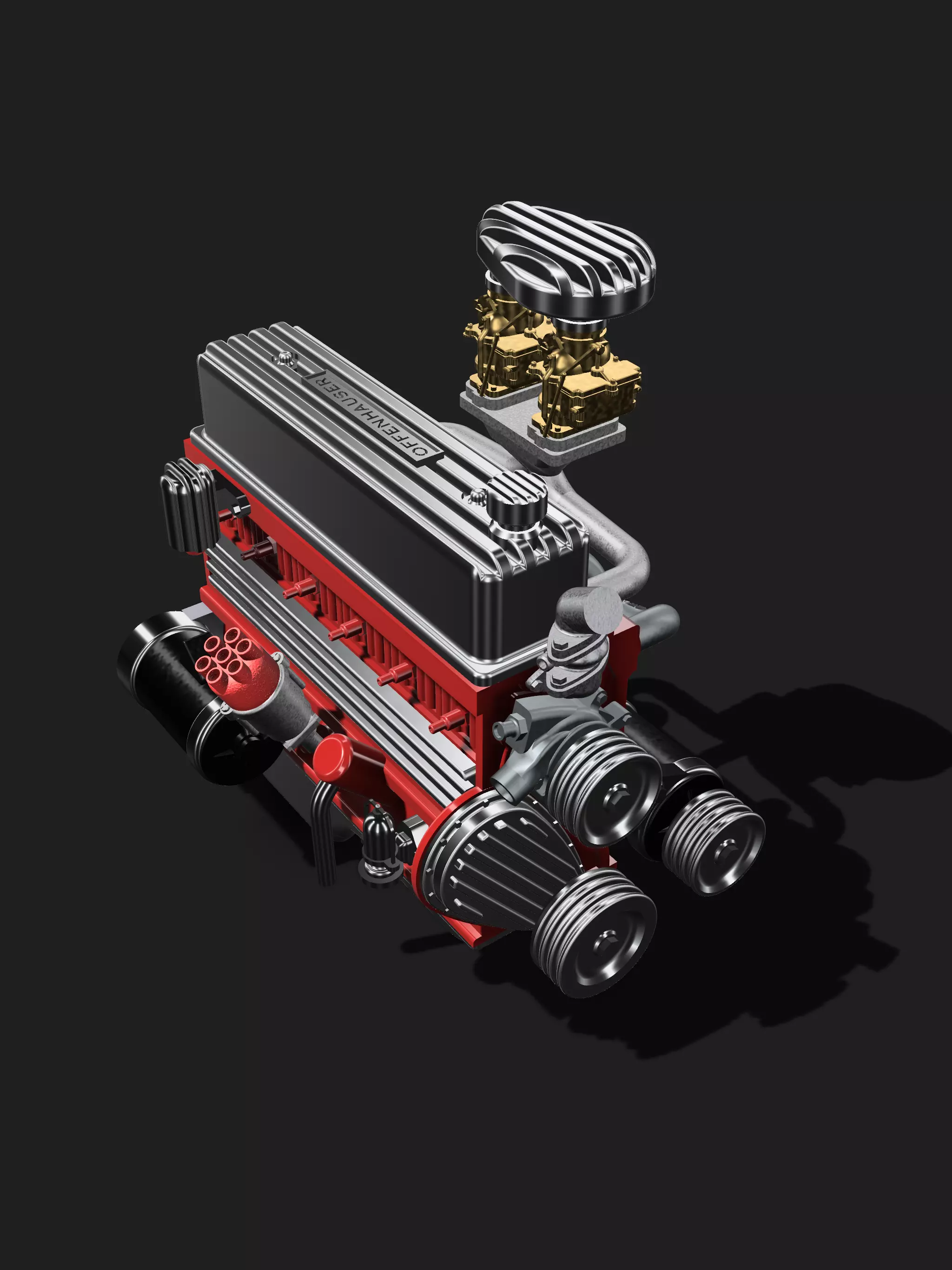 Designed from scratch is a vintage 1940s/1950s Chev 235 engine, with period correct vintage accessories in a Lowrider/Bomb/Kustom style, high in detail, ideal for scale modeling (currently in 1/24 and 1/25 scale).